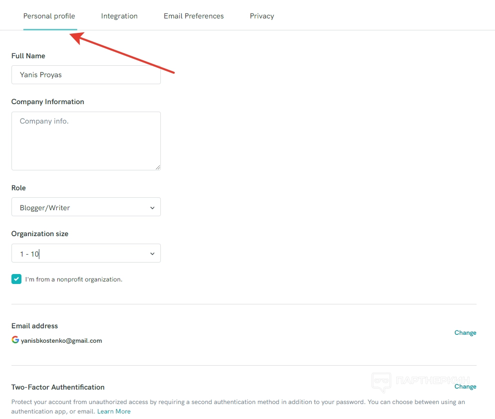 - Личная информация. Тут можно изменить информацию о себе и о компании, которую представляет юзер. Также здесь можно активировать многофакторную аутентификацию и ли удалить аккаунт.