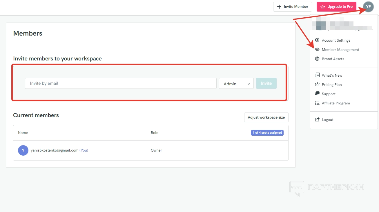 Если нужно выдать доступ к аккаунту стороннему пользователю, вызываем контекстное меню под логином и открываем блок «Управление участниками». В указанную строку вносим электронный адрес и выдаем права.