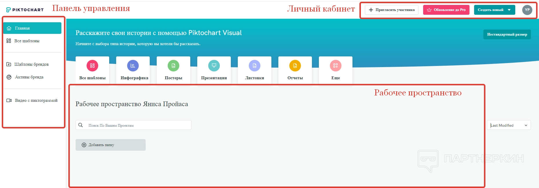 Панель управления состоит из нескольких разделов. Первым разделом является «Главная». Здесь в рабочем пространстве отображаются самые популярные шаблоны, а также есть кнопка для создания папок, в которых пользователь может хранить свои проекты.