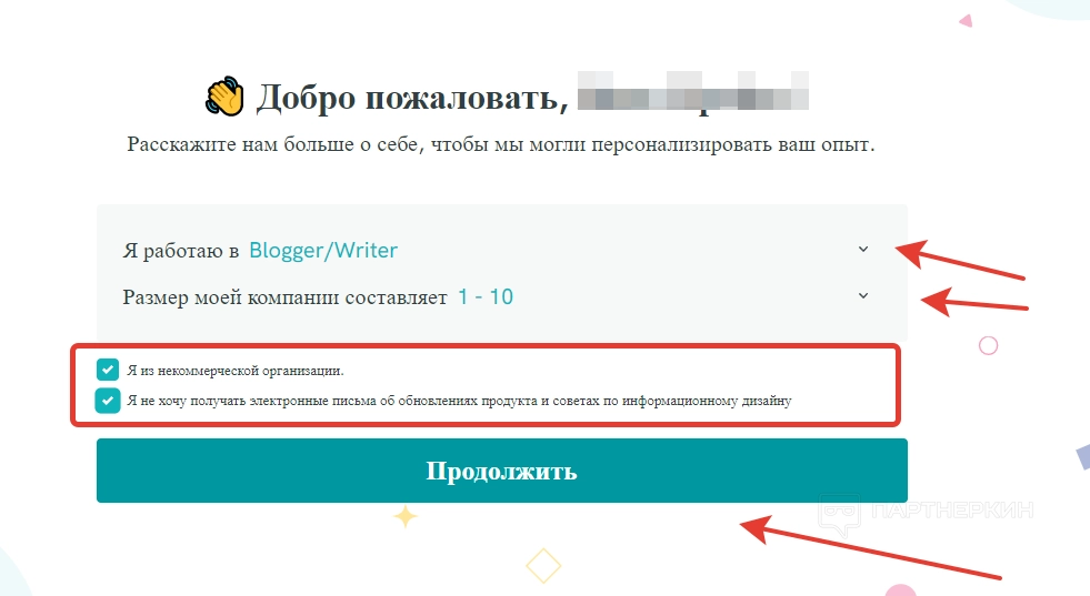 В первую очередь нужно указать направление, в котором работает пользователь. Это может быть блогерство, маркетинг, администрирование веб-ресурсов и многое другое. Далее придется указать количество человек, которые работают над проектом. В конце даем согласие с условиями пользования и жмем кнопку «Продолжить».