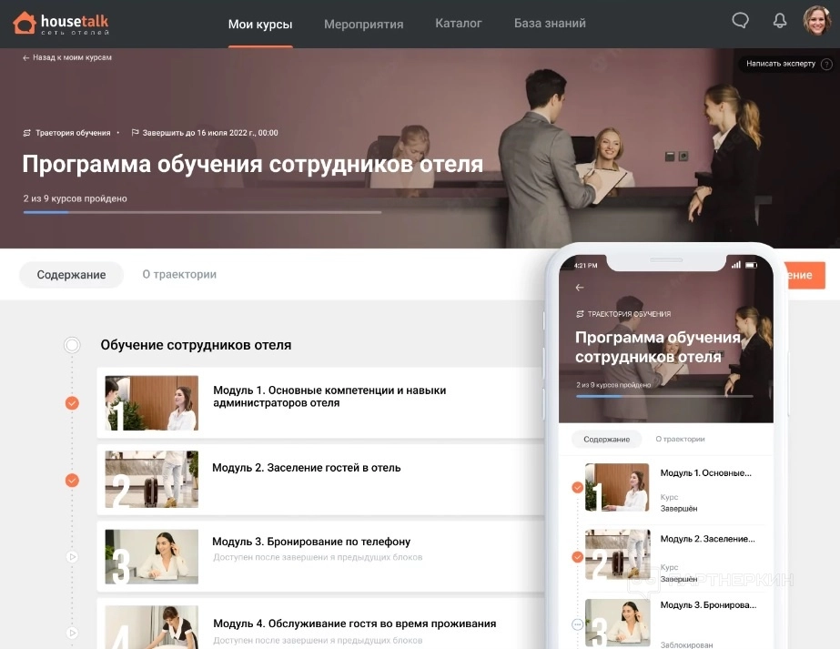 С помощью этого модуля можно обучать работников сферы туризма и гостиничного дела. Включены такие курсы, как навыки общения с гостями, решение нестандартных ситуаций. Загружен авторский курс Марины Земсковой, президента Ассоциации отельеров и рестораторов Владимирской области. Также каждый клиент может создать и загружать свои курсы.