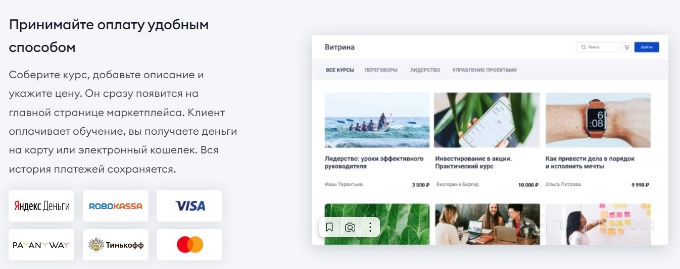 - Готовый маркетплейс . Это площадка продажи курсов, организованная в виде витрины. Она имеет встроенный функционал по приему платежей от клиентов. Дизайн кастомизирован: можно добавлять свои логотипы, фирменные цвета, обложки курсов.