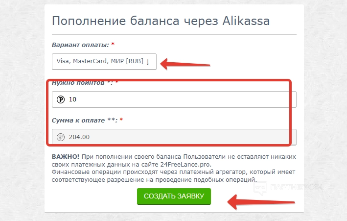 Далее выбираем способ оплаты, указываем количество поинтов (PNT) и жмем «Создать заявку» Система автоматически спишет необходимое количество денег в рублях и конвертирует их в PNT.