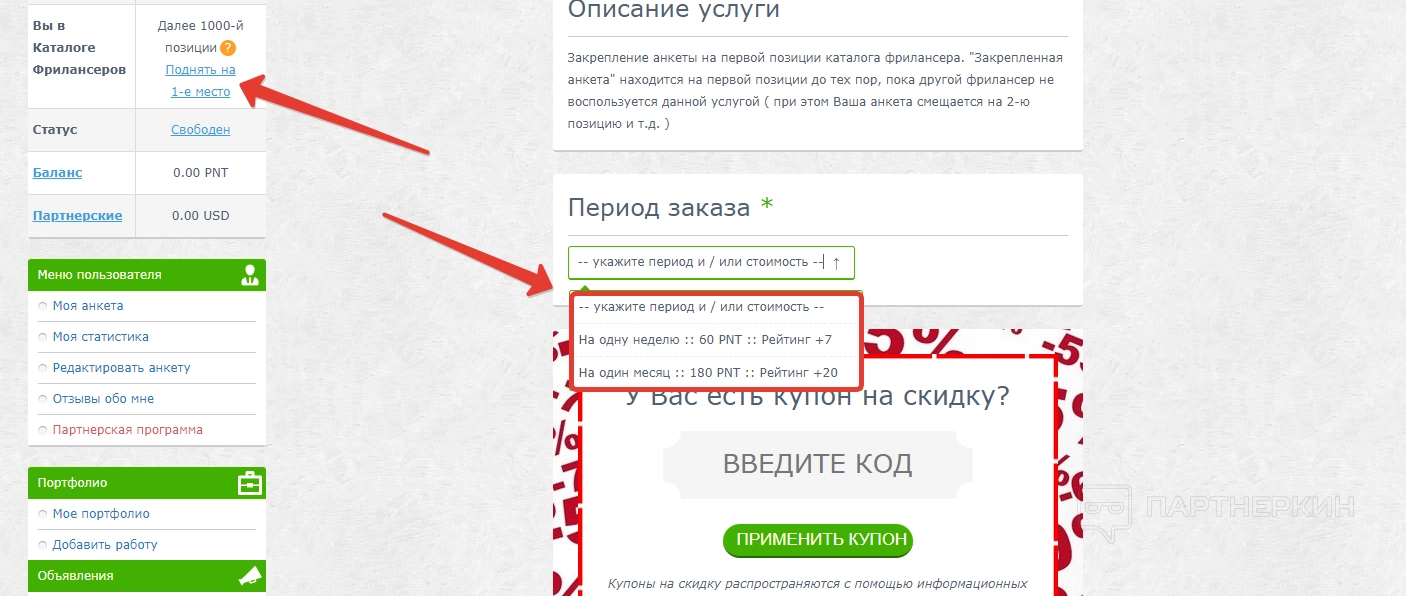 Обращаем внимание на то, что с помощью поинтов можно продвигать свою анкету в каталоге фрилансеров.