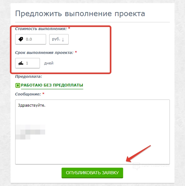 Чтобы откликнуться, жмем на название проекта и попадаем в форму, где нужно указать стоимость своих услуг, продолжительность выполнения и сообщение (комментарий). В конце жмем «Опубликовать заявку» и ждем одобрения.