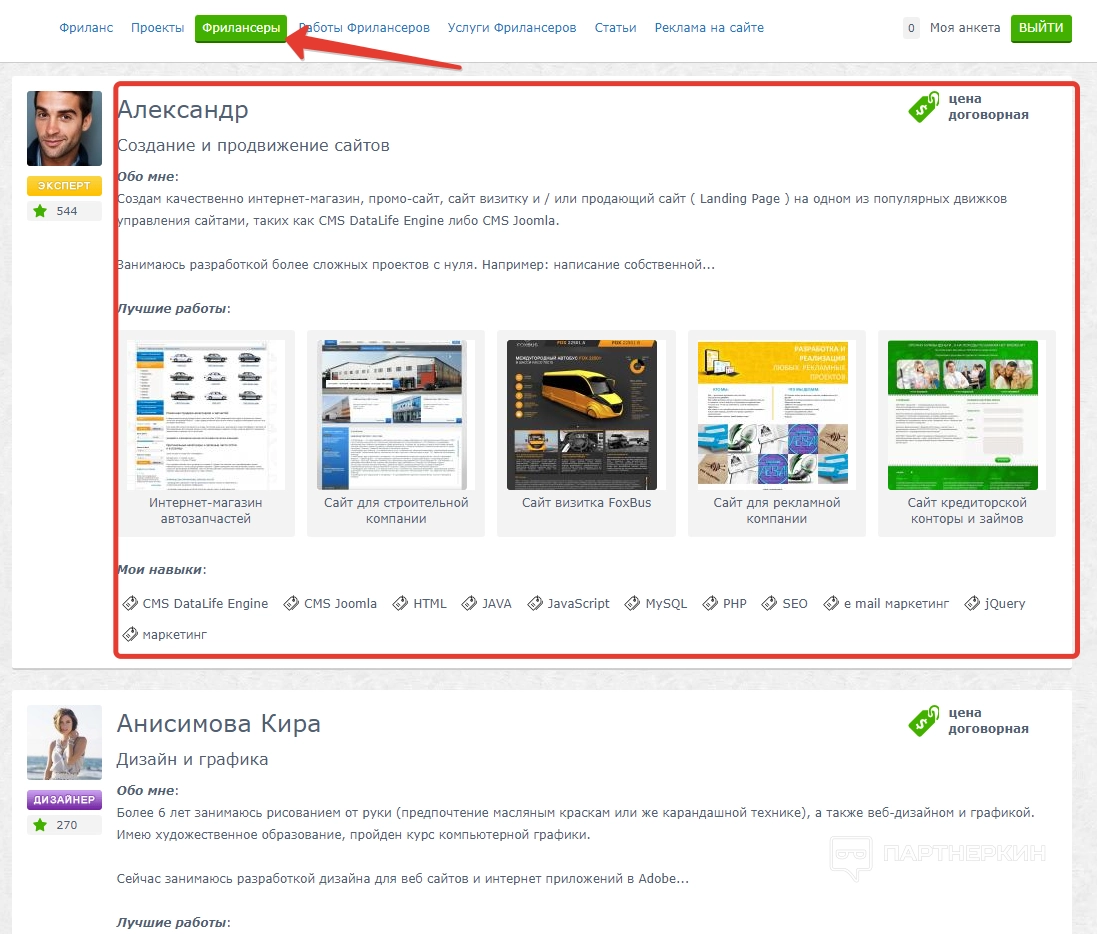 Следующий раздел — «Фрилансеры». Он рассчитан для заказчиков, которые хотят найти исполнителя. Фильтра, к сожалению, здесь нет, поэтому искать вебмастера придется вручную. Каждая карточка фрилансера состоит из следующих параметров: