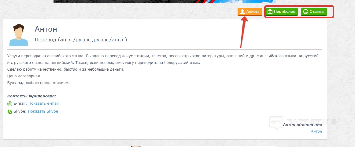 В открытой карточке отображаются имя, подробности услуги, стоимость и контактная информация. Чтобы получить больше информации об исполнителе, кликаем на кнопку «Анкета». Рядом есть вкладки, с помощью которых можно ознакомиться с работами специалиста и отзывами о его работе.