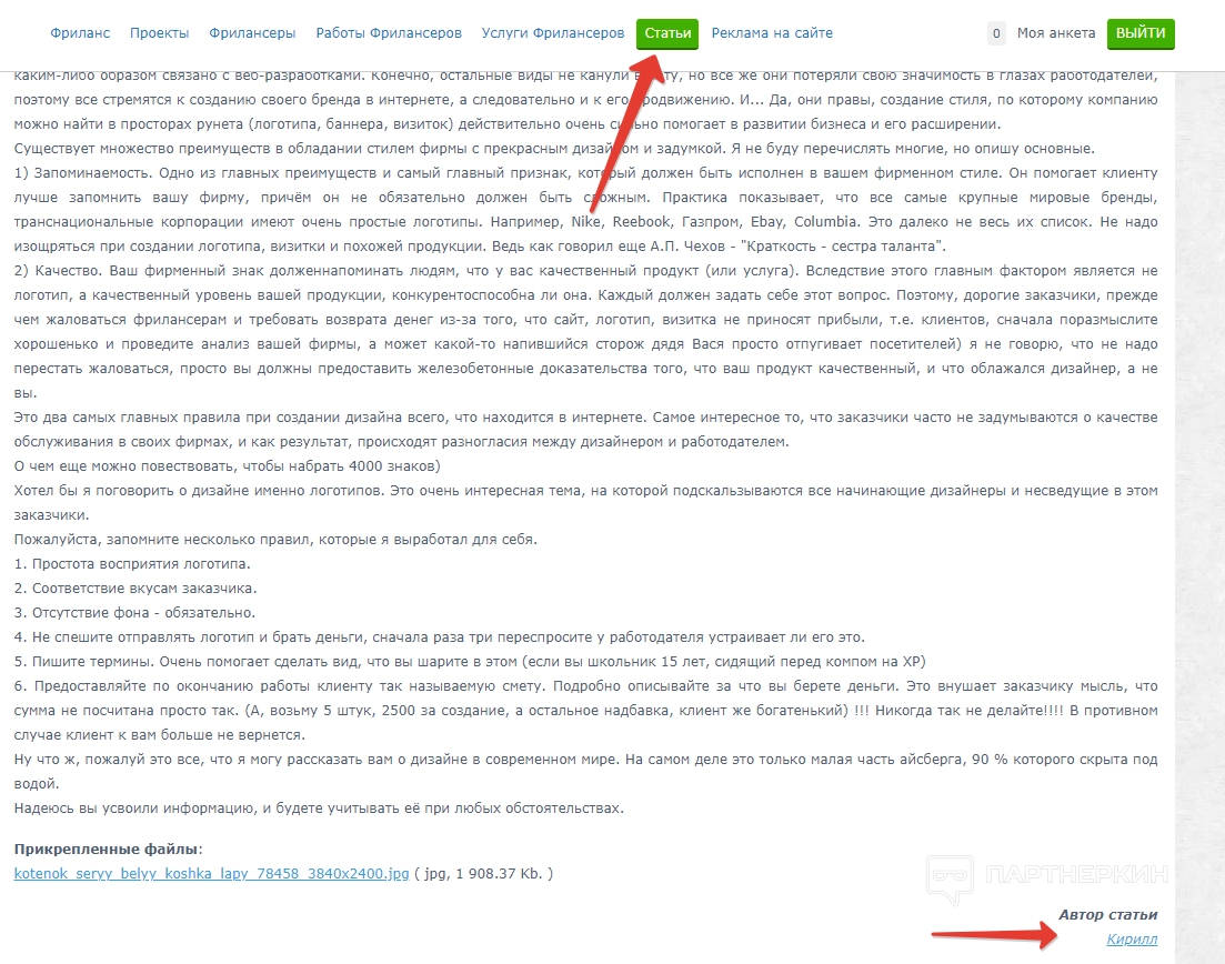 Далее идет раздел «Статьи», в которых отображаются выставленные на продажу статьи. Чтобы ознакомиться с содержимым карточки, просто жмем на название. В нижней части статьи будет прикреплен контакт автора, с которым можно связаться для ее приобретения.