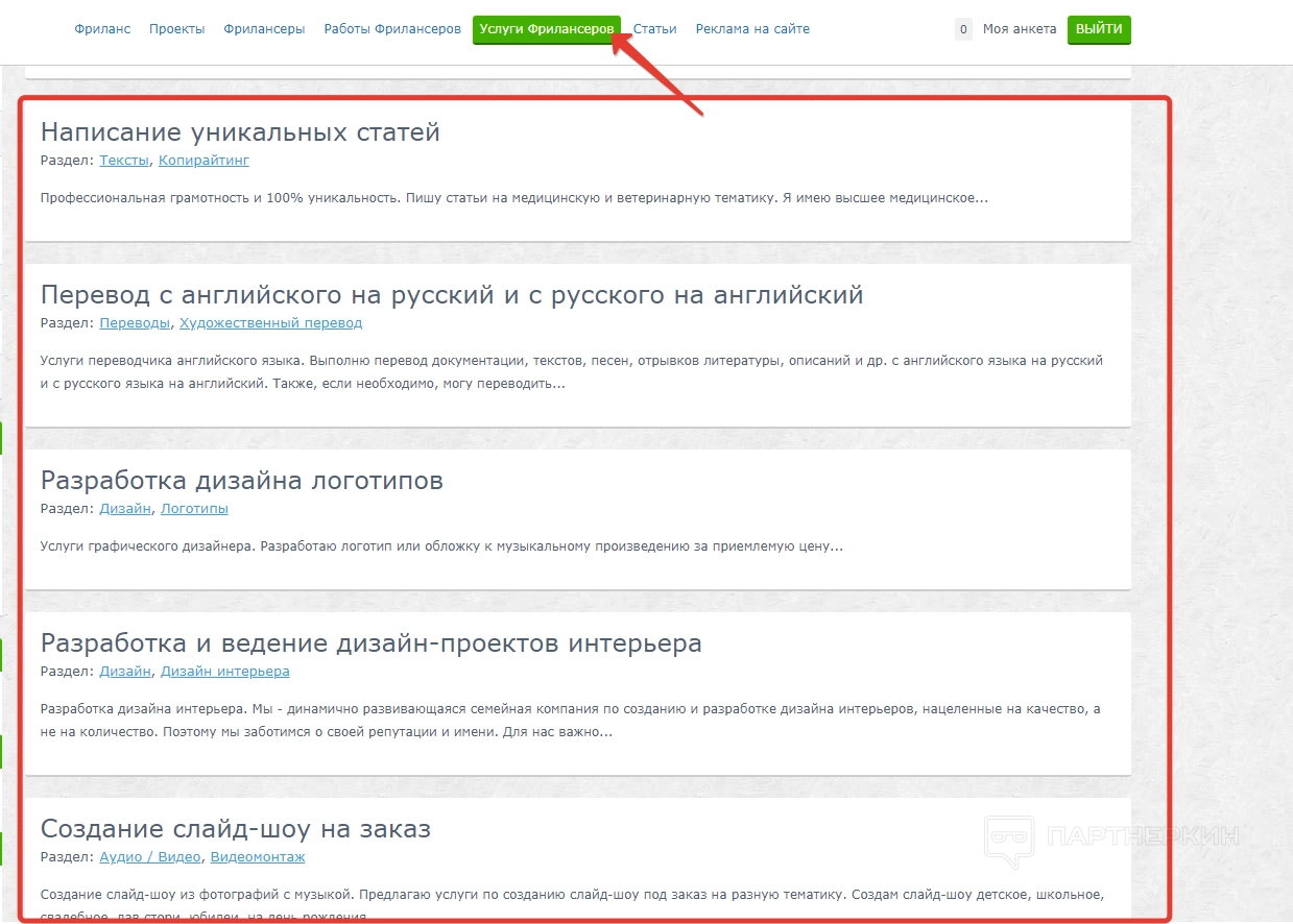 В разделе «Услуги фрилансеров» заказчик может найти исполнителя по предоставляемым услугам. Для поиска можно задействовать такой же фильтр, как и в предыдущем разделе. Каждая услуга состоит из названия и описания. Больше информации заказчик получит в том случае, если откроет карточку.