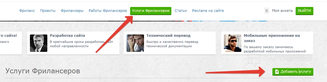 Чтобы оформить свою услугу, переходим во вкладку «Услуги фрилансеров» и в правой части экрана жмем на «Добавить услугу». Далее откроется окно, где будет сказано, что для размещения услуг нужно улучшить аккаунт. Жмем на соответствующую кнопку и переходим к следующему этапу.