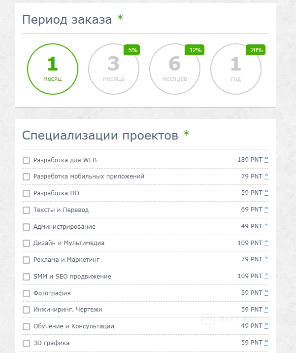 Далее откроется форма, где нужно выбрать период заказа и специализацию проектов. Обращаем внимание, что стоимость у каждой специализации разная.