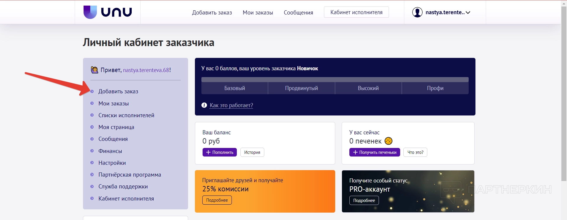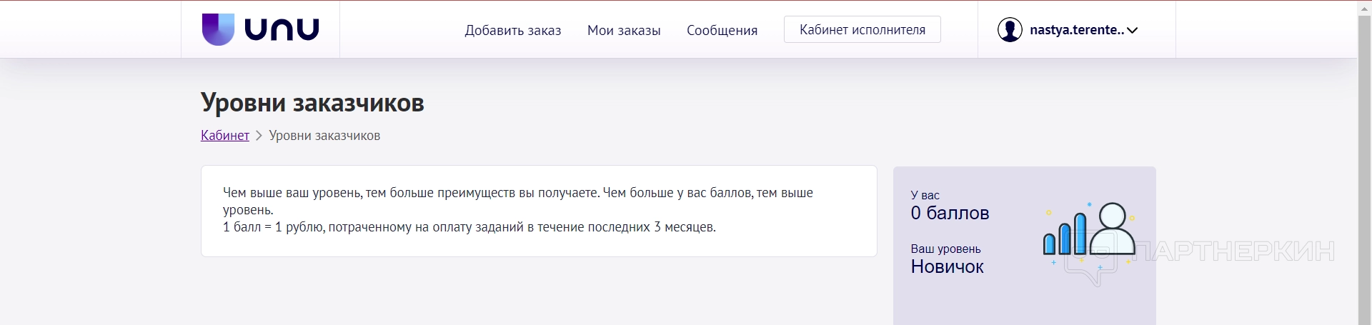 Кабинет заказчика. В кабинете заказчика происходит управление работой. На главном экране представлена шкала с уровнем заказчика на платформе, а также количество средств на счет, количество внутренней валюты — печенек и баннеры с партнерской программой и рекламой PRO-аккаунтов. Особенно интересна шкала с уровнями, так как она влияет на рейтинг заказчика или исполнителя на платформе, причем не обязательно вносить деньги на счет, чтобы увеличивать уровень — достаточно просто регулярно публиковать задания и оплачивать их.
