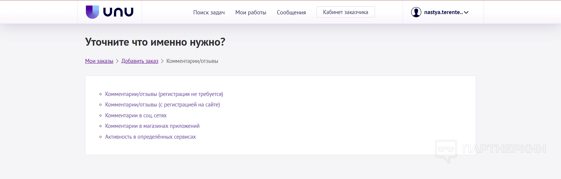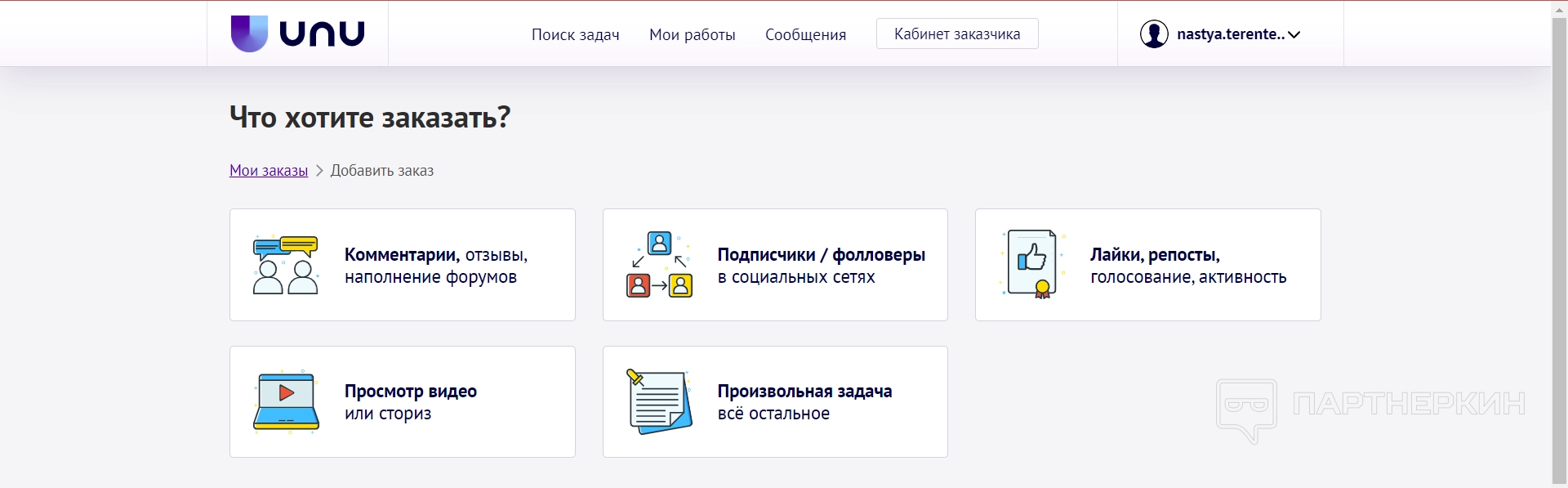 В кабинете заказчика пользователи также могут перейти в главный раздел, где добавляются задания — для этого нужно нажать на одноименную команду «Добавить заказ». В таком случае пользователь попадает в то же главное меню, которое рассматривалось выше.