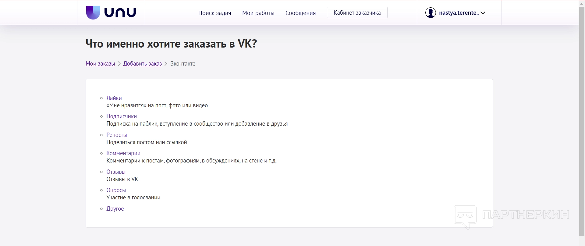 Добавлять задания можно и другим способом — непосредственно через выбор социальной сети. Достаточно просто выбрать нужную соцсеть и выбрать тип задания. Например, если выбрать Вконтакте, то перед пользователем откроются такие услуги, как: