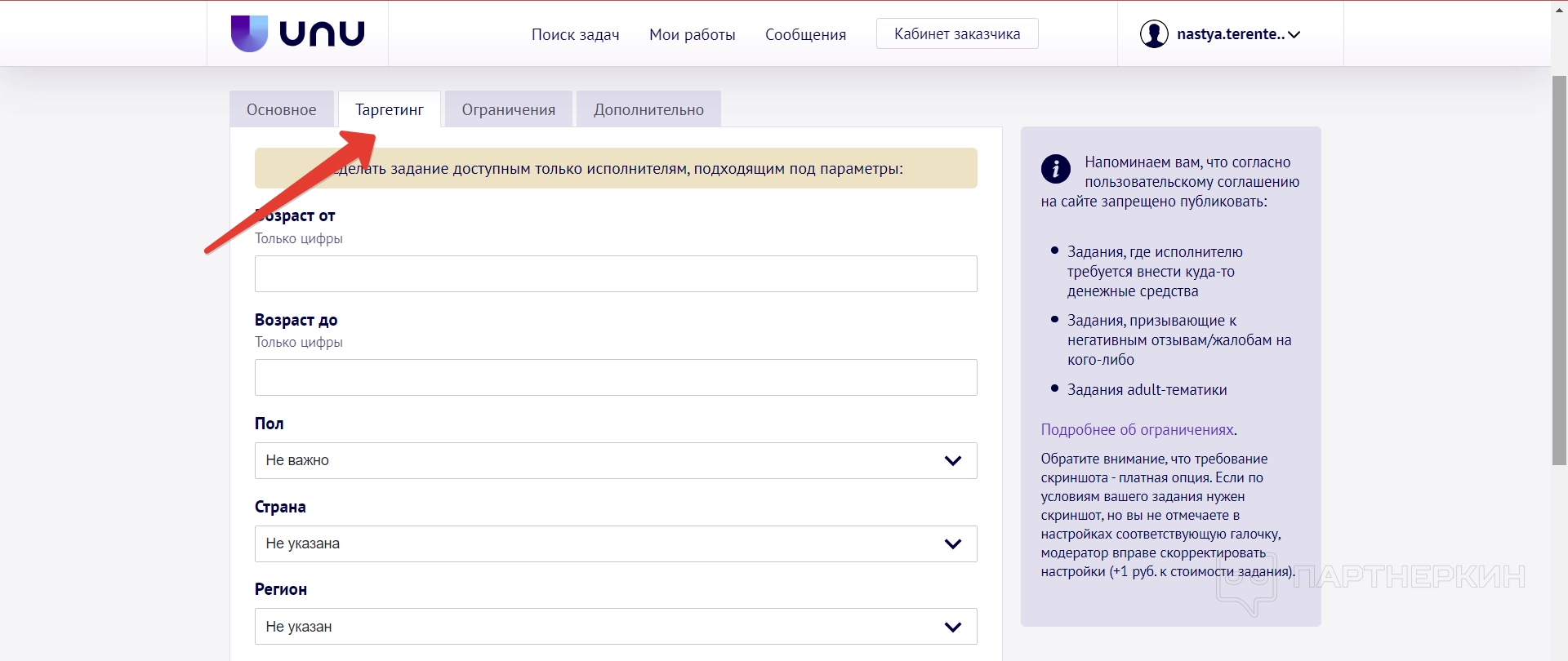 - таргетинг — в этом разделе пользователь может указать данные об исполнителях, которые будут видеть заказ. Там вводится информация вроде возраста, пола, страны проживания, региона, города и устройство, с которого будут заходить на ресурс пользователи;