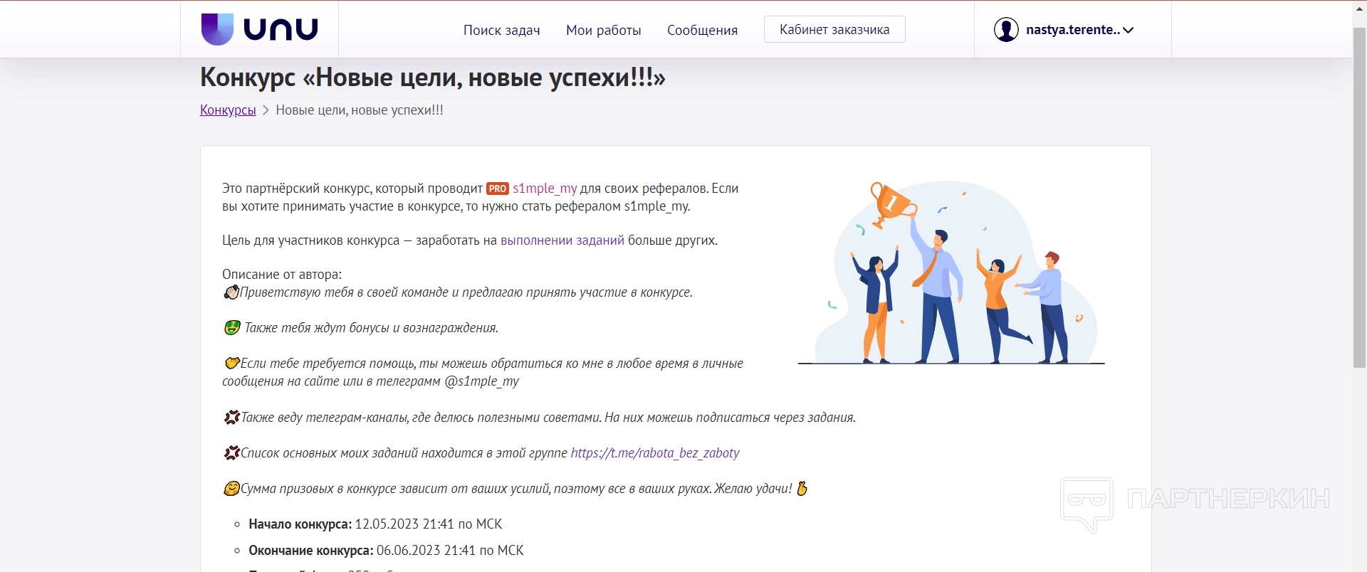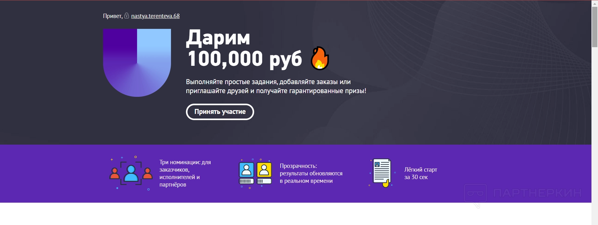 Если перейти в партнерские конкурсы, то отдельный лендинг не будет открываться — откроется простая типовая страница с условиями. Там прописывают, кто является автором конкурса, условия конкурса, а также сроки и призовой фонд.