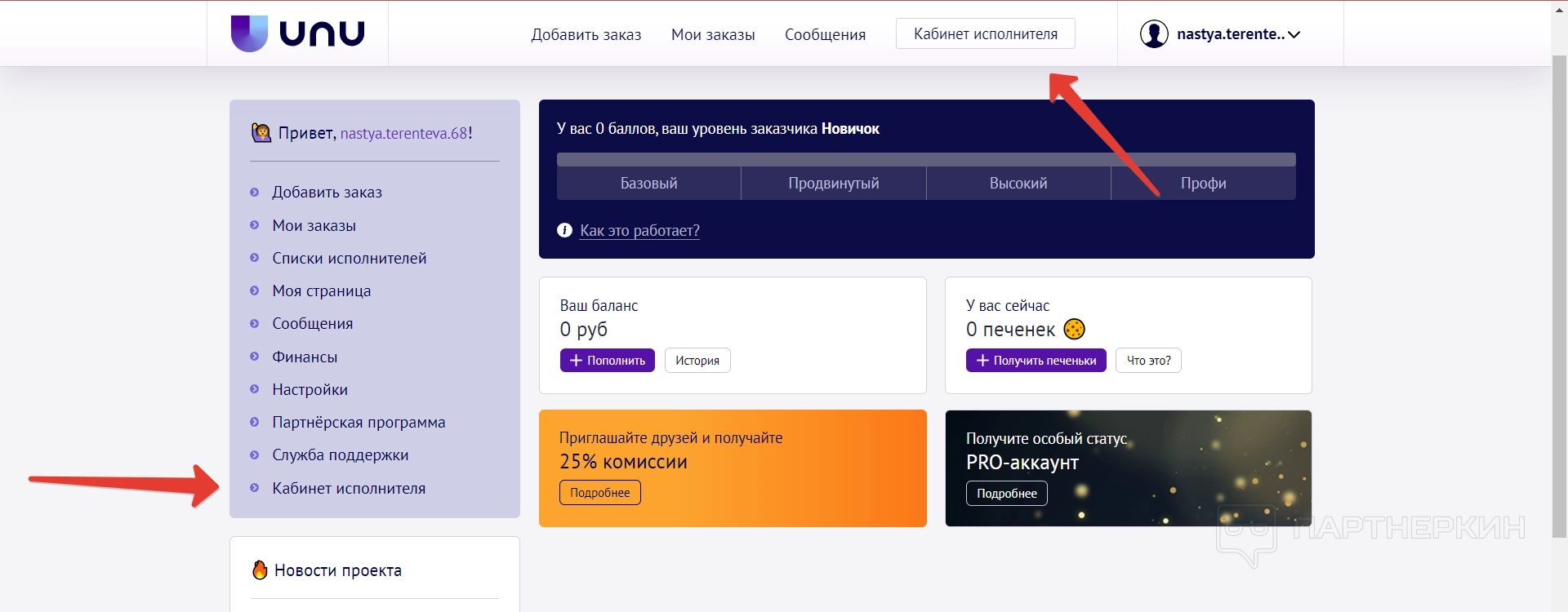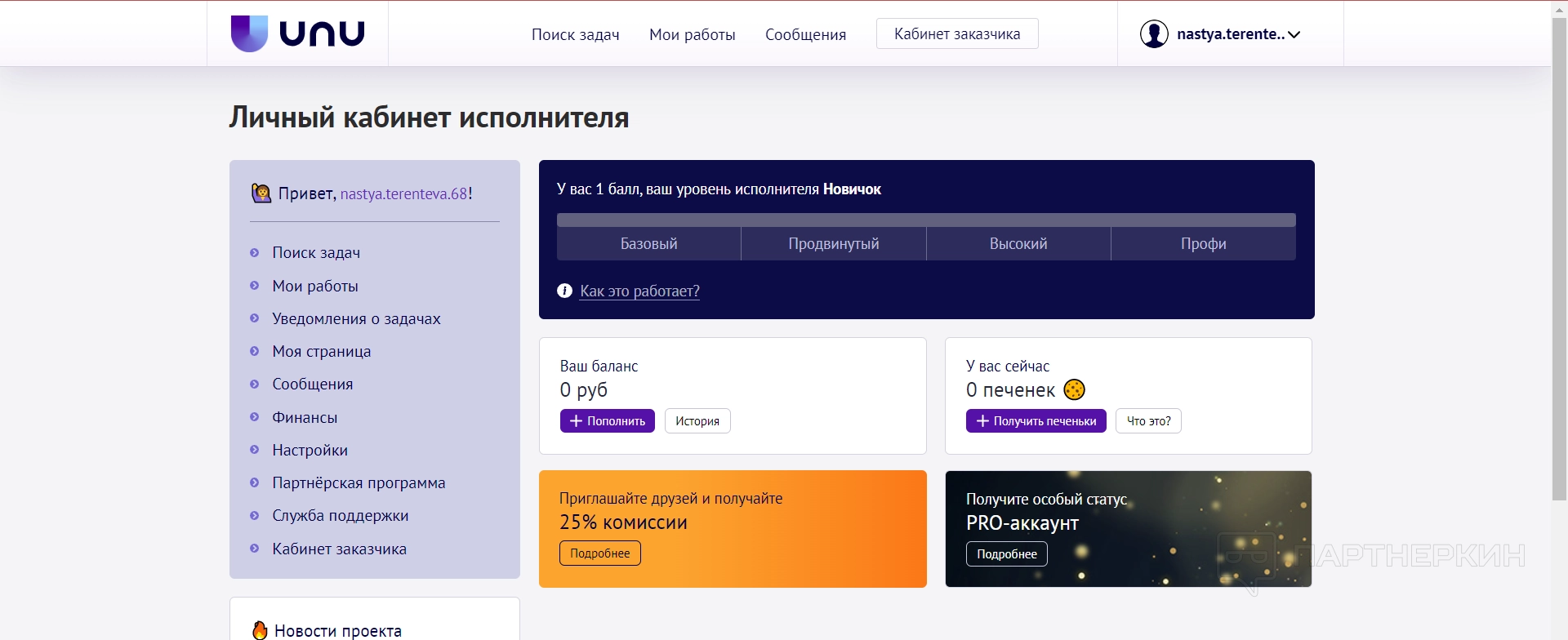 Кабинет исполнителя. Это основной раздел, в котором происходит управление работой исполнителя. На главном экране отображаются данные о балансе пользователя, количестве печенек, а также предложения об участии в партнерской программе и получении PRO-статуса на платформе. Печеньки являются внутренней валютой платформы, которые позволяют исполнителям улучшать свой статус на бирже.