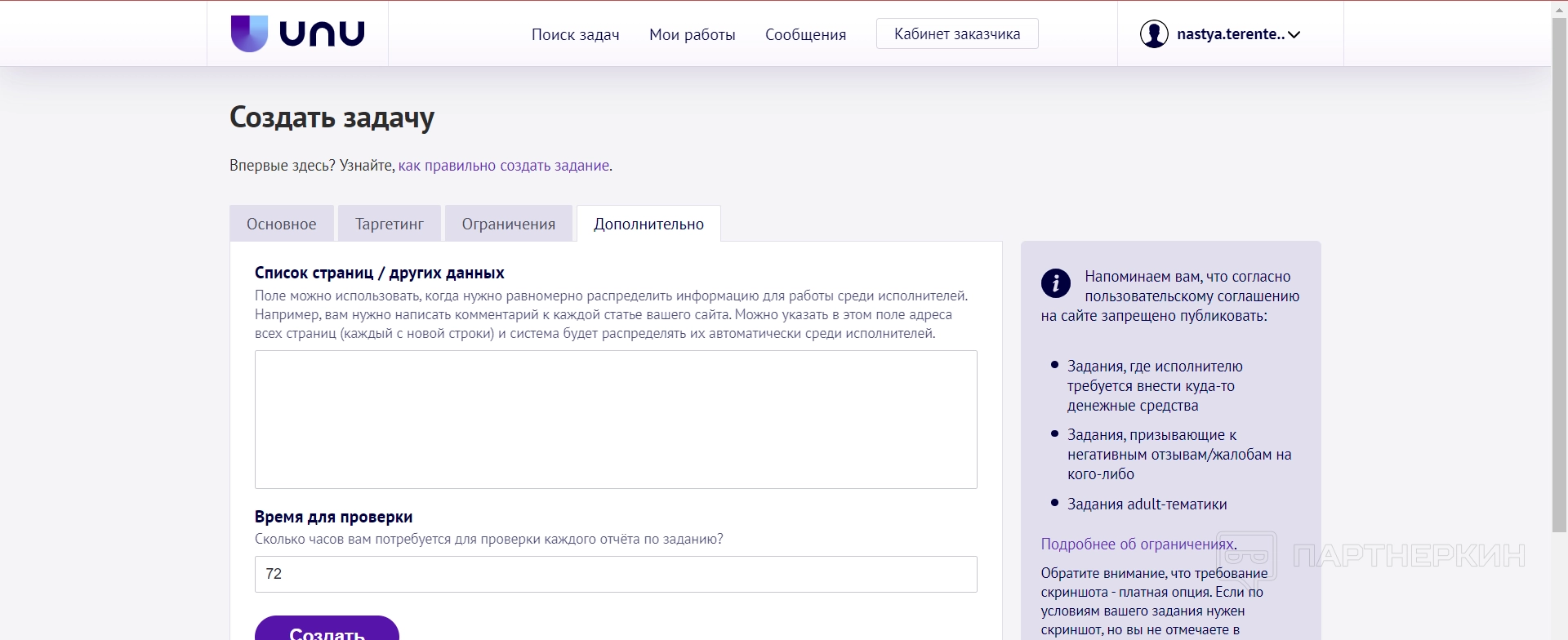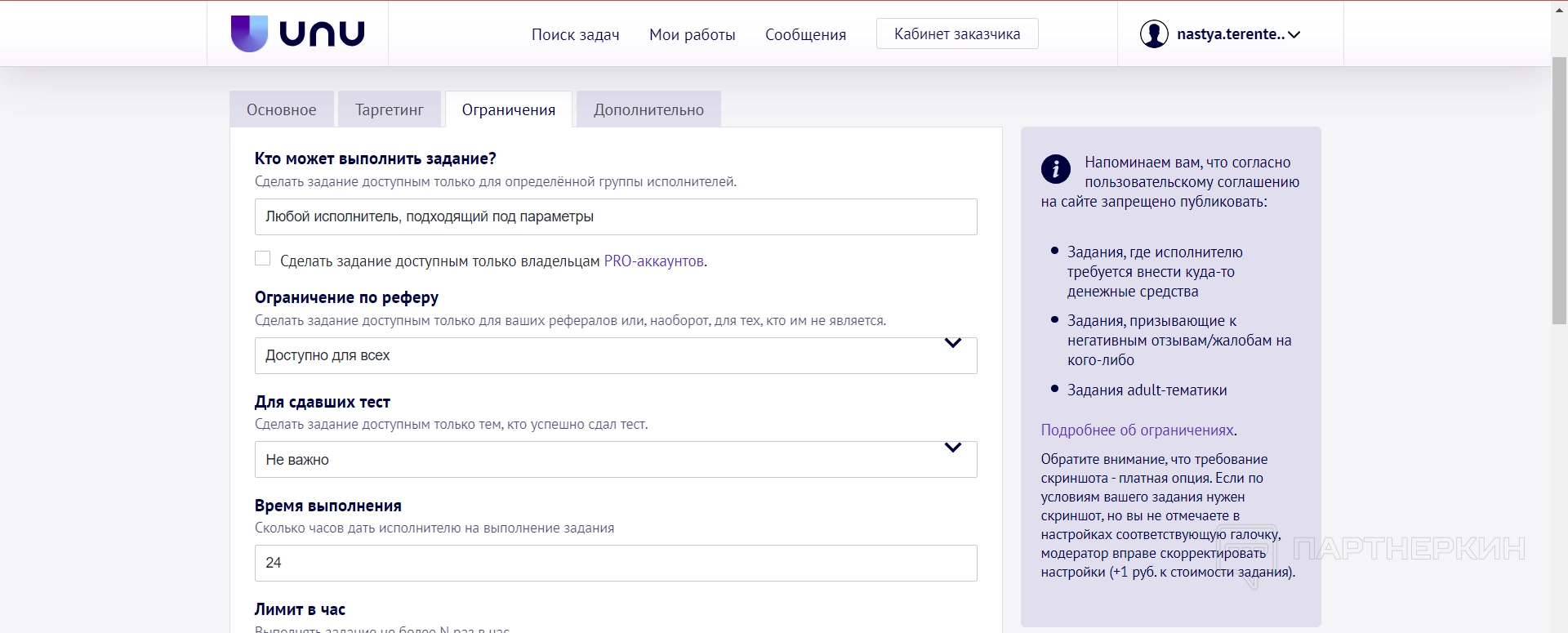 - ограничения — в этом разделе указываются все ограничения, чтобы задание не смогла увидеть неподходящая аудитория. Например, можно указать группу исполнителей, ограничение по реферу, возможность выполнения для тех, кто не сдал тест, время выполнения, разнообразные лимиты и так далее;