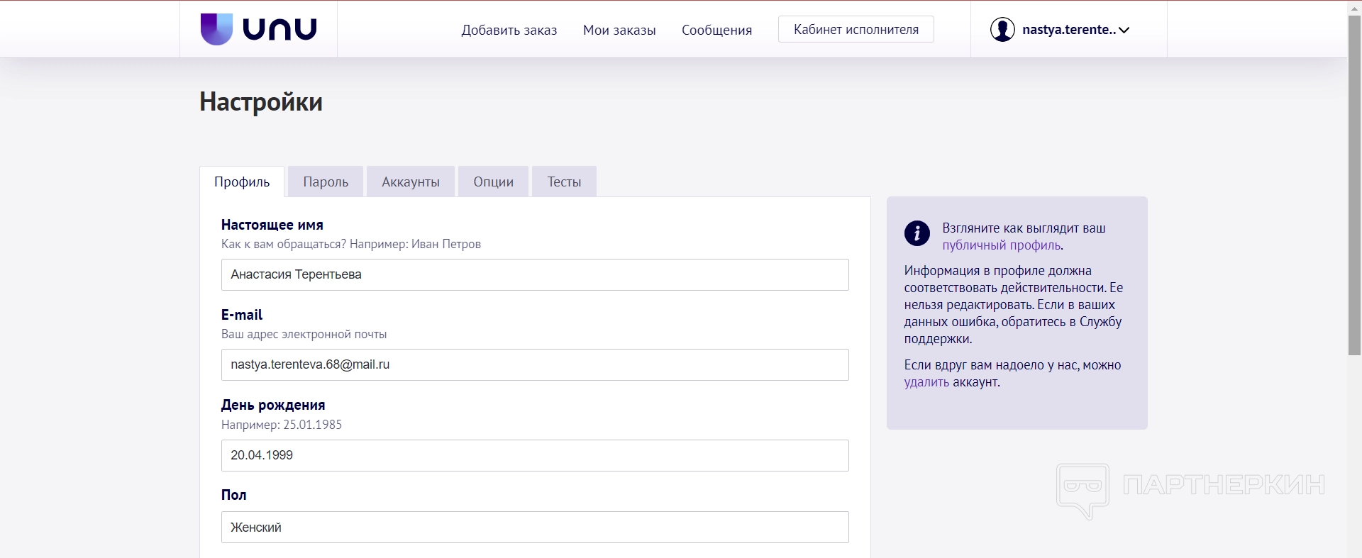 В настройках можно изменить данные об имени и фамилии, об электронной почте, дате рождения, поле, а также обновить аватарку. Если нужно, аккаунты можно удалять здесь же. Помимо этого, здесь изменяется пароль, подключаются новые аккаунты для интеграции, настраиваются типы уведомлений по почте и дается информация и пройденных тестах. Если тест не пройден, можно в любое время это сделать — тест касается знаний в области русского языка.
