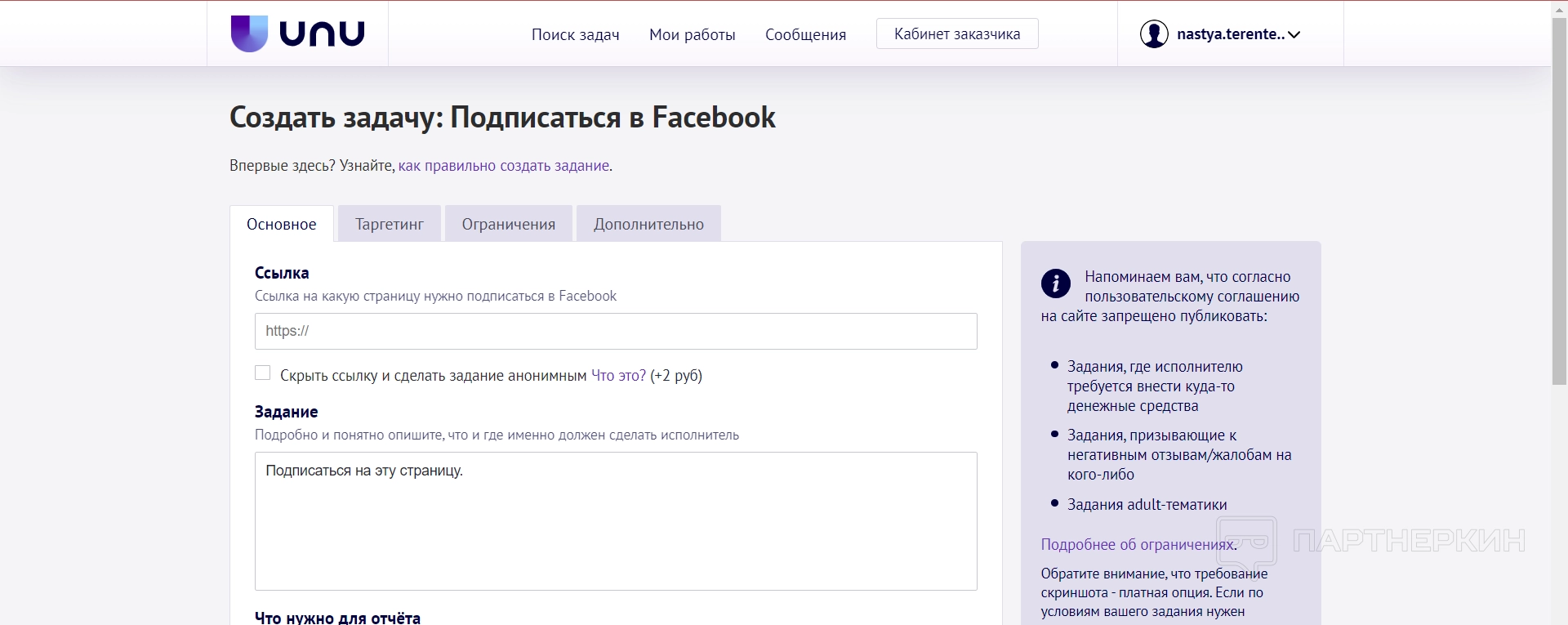 Мы выбрали вариант с Facebook* и попали в меню настройки задания. Есть также все разделы, которые описывались в предыдущем блоке — это основные, таргетинг, ограничения и дополнительно. Три последних никак не меняются, но зато меняется меню с основными настройками, поэтому далее будем рассматривать только его.