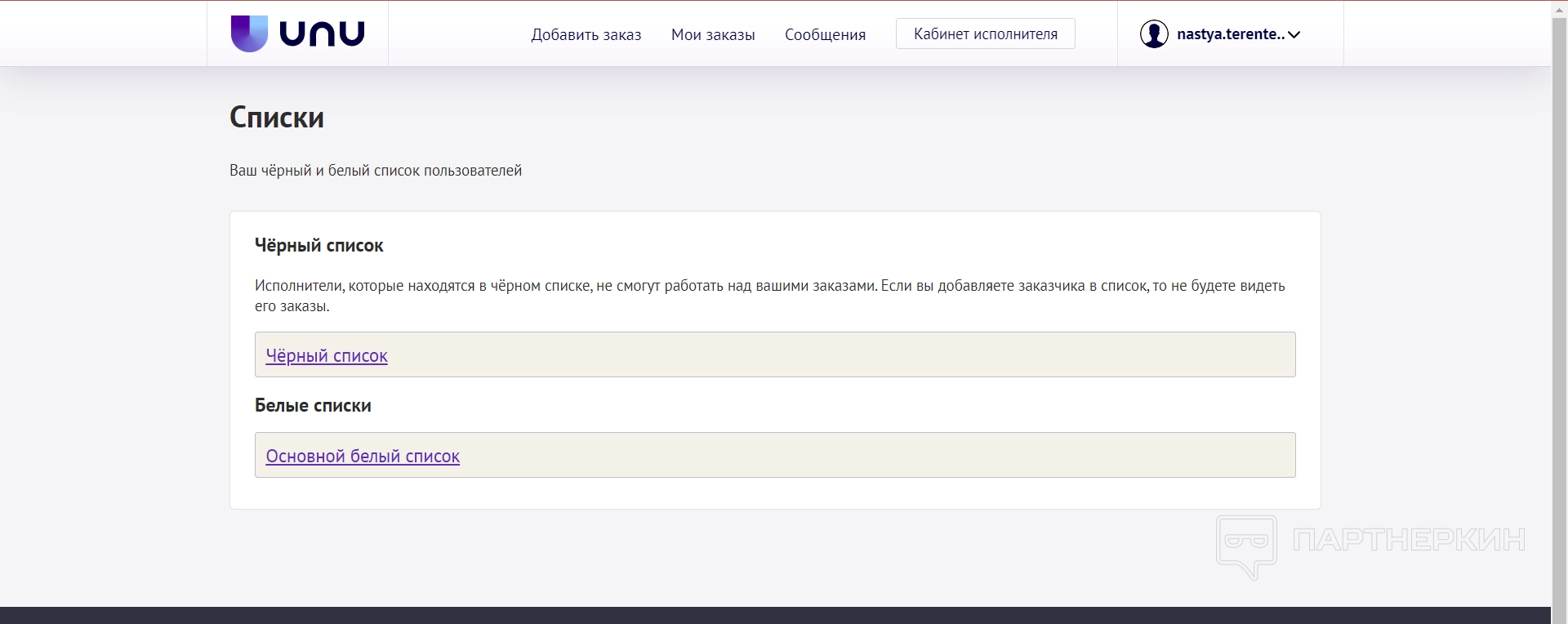 Далее уже идет список исполнителей — здесь можно создавать собственные черные и белые списки. Если заказчик добавит пользователей в черный список, то они не смогут видеть и выполнять все его задания. Если пользователи будут в белом списке, то они смогут без проблем браться за новые задачи, которые публикует заказчик. Эти списки также удобны тем, что можно не искать отдельных исполнителей и не ждать их откликов, а сразу отправлять задание нужному человеку, чтобы он оперативно его выполнил.