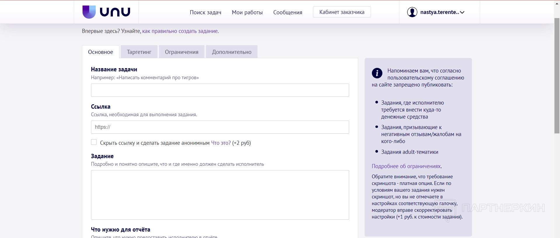 Как видно из скрина, это далеко не вся информация о задании, которую можно указать. Заказчик может подробно описать информацию о таргетинге, ограничениях, а также любые дополнительные данные. Для этого ему нужно перемещаться между разделами вверху.