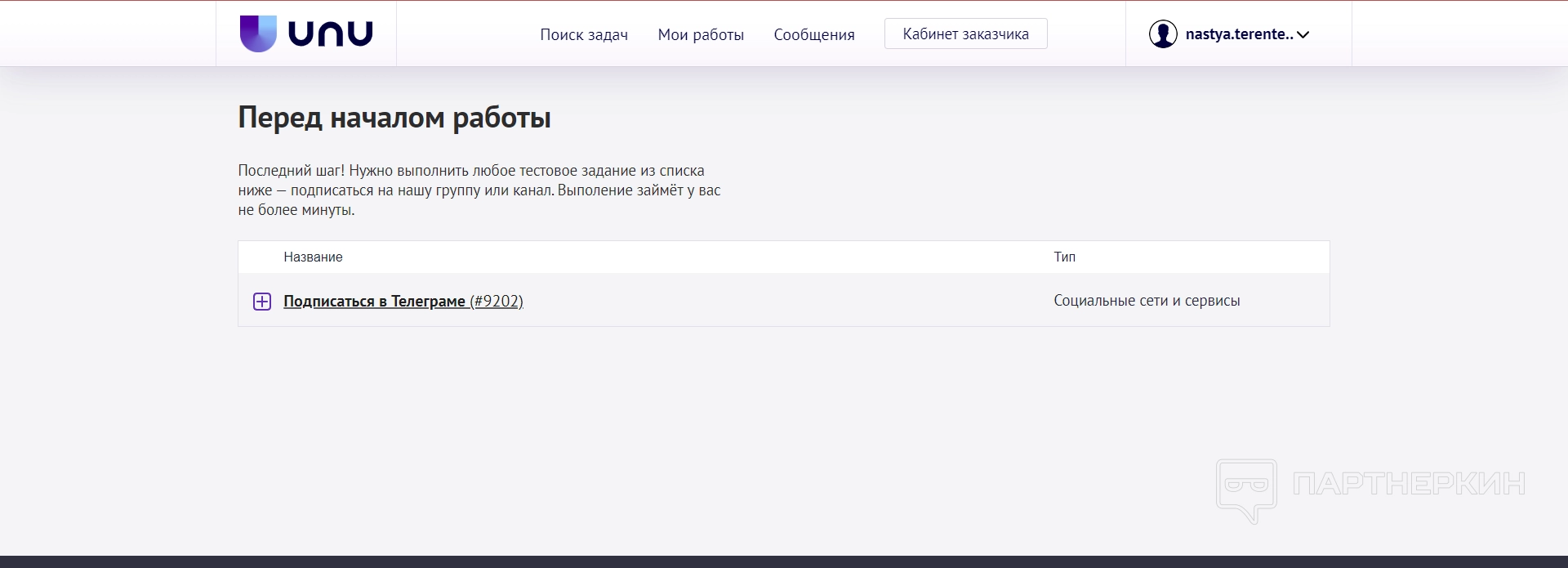Поиск задач. Данный раздел включает информацию обо всех заданиях, которые сейчас есть на платформе. Их можно фильтровать для удобства, но предварительно придется выполнить первое тестовое задание — подписаться на телеграм-канал биржи.
