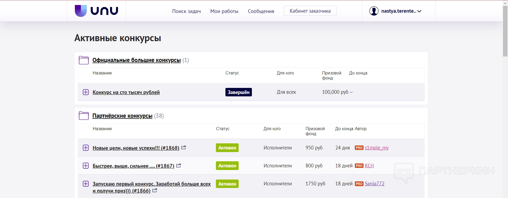 Как видно из скрина, меню включает уже знакомые разделы, но здесь есть и новый пункт — это «Конкурсы». На данной странице пользователи могут просматривать все актуальные конкурсы платформы — среди них партнерские и официальные конкурсы.