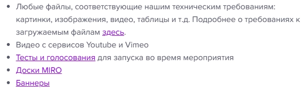 Организатор мероприятия может загрузить файлы к вебинару до, во время и после прямой трансляции. Чтобы не тратить время в эфире и чувствовать себя увереннее на стриме, лучше прикрепить необходимые документы заранее. Пользователь может добавить следующие файлы: