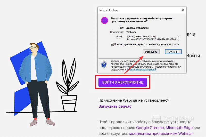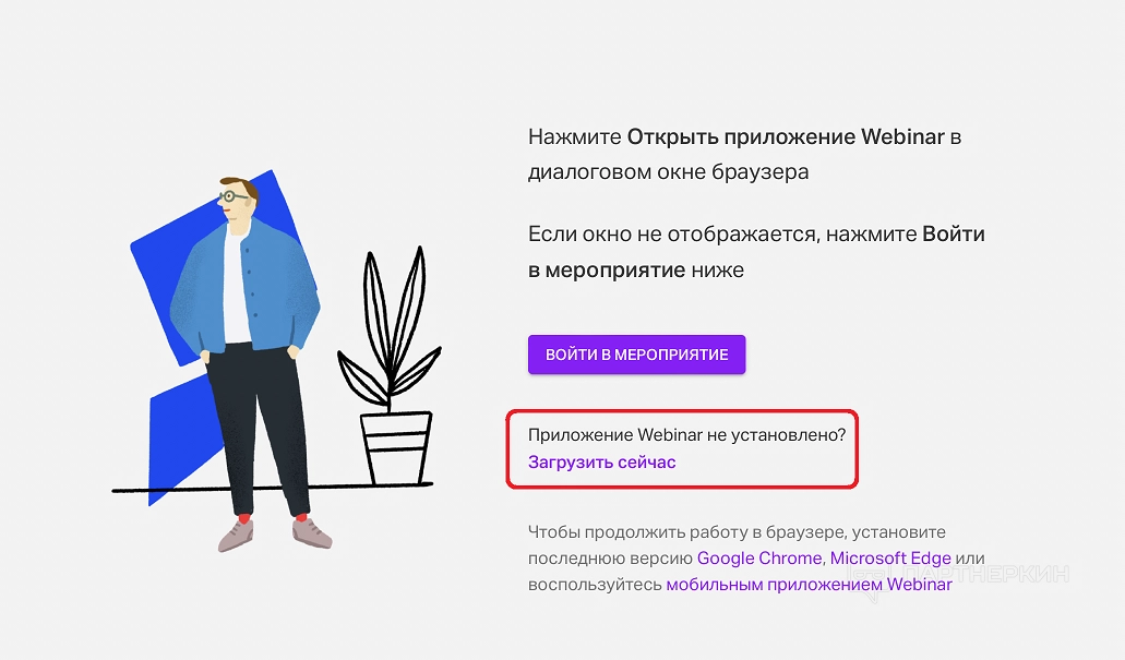 Если пользователь не может присоединиться к вебинару через браузер, необходимо установить программу