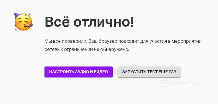 Перед началом мероприятия необходимо проверить работу камеры, микрофона и динамиков. Для этого нужно нажать на значок профиля в правом верхнем углу и выбрать пункт «Тест системы».