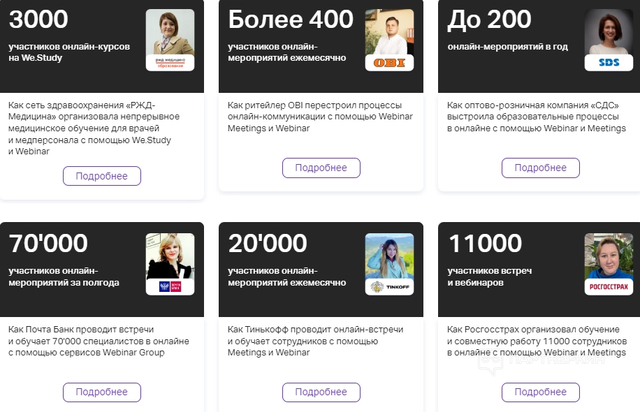 Клиенты, которые используют площадку Webinar, работают в разных отраслях — промышленности, фармацевтике, IT-компаниях, государственных секторах и других направлениях. Для Webinar не существует границ — платформой могут пользоваться люди из любой сферы деятельности.