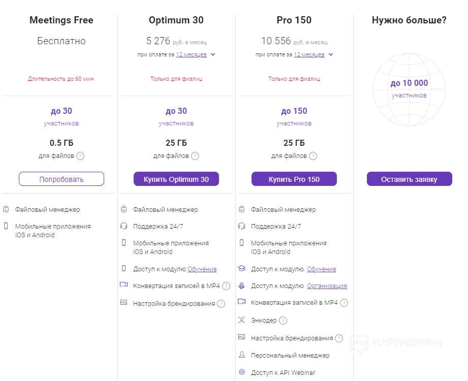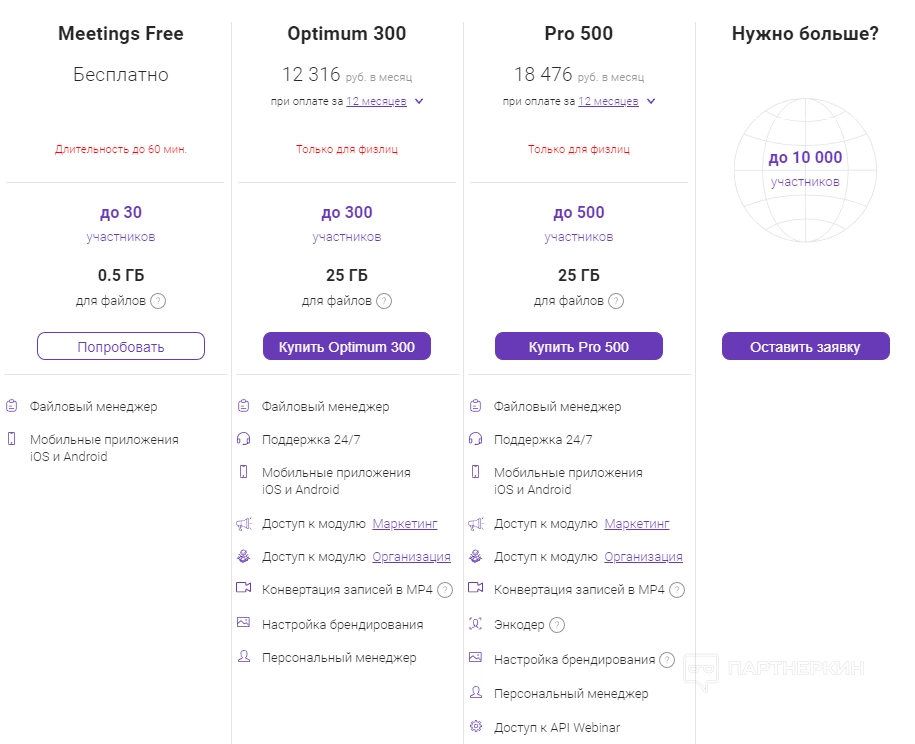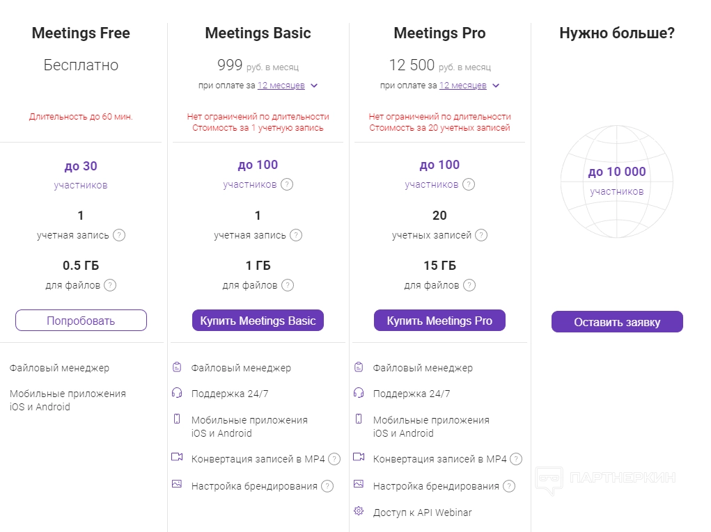 предлагает клиентам тарифные планы для трех разных категорий: совещаний, маркетинга и обучения. Каждая линейка отличается стоимостью, длительностью, количеством участников, учетных записей и дополнительными возможностями (например, наличием файлового менеджера или приложений для операционных систем iOS и Android).
