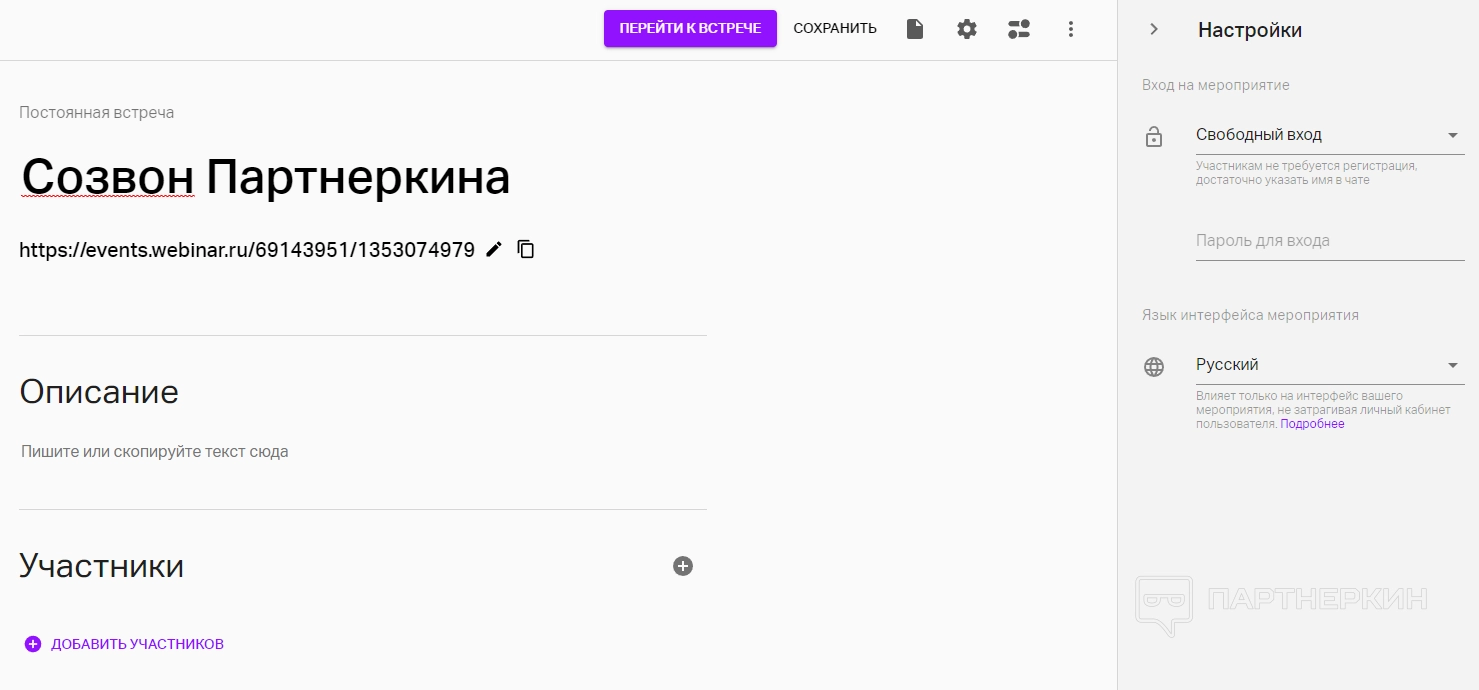 1. Настроить лендинг мероприятия. Придумать название, составить описание, добавить участников. Настроить уровень доступа (свободный вход, регистрация), ввести пароль и установить язык интерфейса — русский или английский.