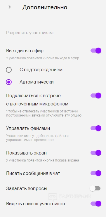 1. Дополнительные настройки прав внутри вебинарной комнаты. Выбрать, смогут ли участники выходить в эфир, будет ли доступен чат и вопросы, список участников и другие опции. Эти параметры можно изменить во время прямой трансляции.