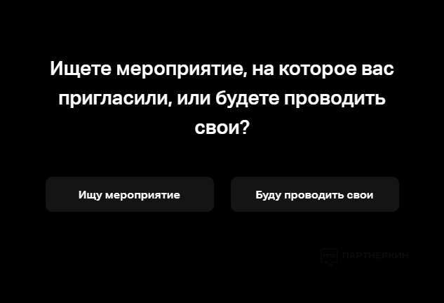 Появится уведомление, где клиенту необходимо выбрать одну из двух опций — «Ищу мероприятие» или «Буду проводить свои».