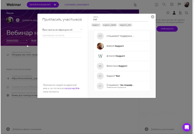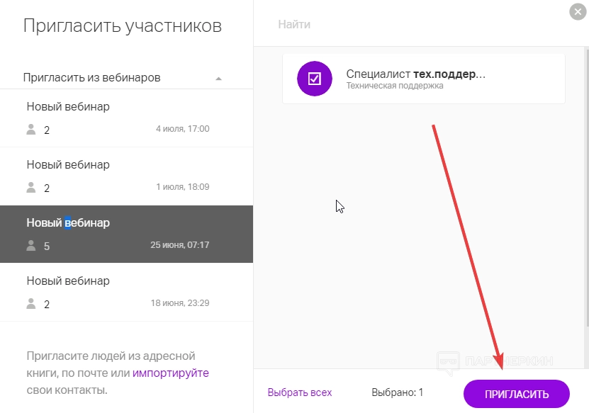 Приглашение участников из предыдущего вебинара. Через пункт меню «Пригласить из вебинаров» можно добавить участников, которые присутствовали на одном из последних четырех стримов. Для этого нужно нажать кнопку «Пригласить».