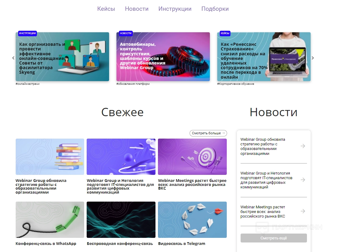 Блог. Здесь находятся кейсы, новости, инструкции и подборки. Можно ознакомиться с популярными и свежими новостями, связанными с онлайн-мероприятиями.