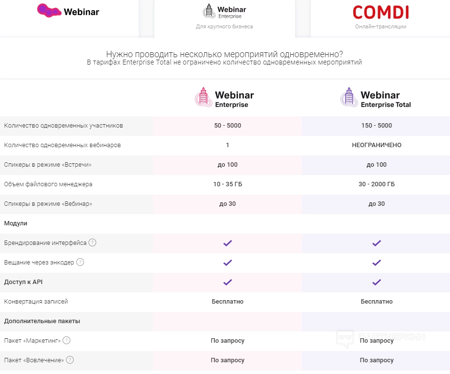 Если нужно провести несколько мероприятий одновременно, подойдут тарифы из категории «Webinar Enterprise» (для крупного бизнеса). В линейке «Webinar Enterprise Total» не установлен лимит на количество одновременных мероприятий.