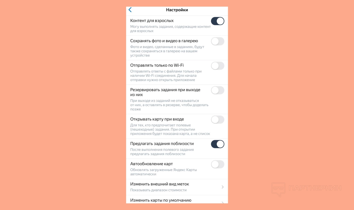 В настройках пользователя можно указать, как будет работать приложение, — например, возможность показа контента для взрослых, сохранения видео и фото, отправки файлов по Wi-Fi, резервировании заданий, открытии карт и их автообновлении и так далее.