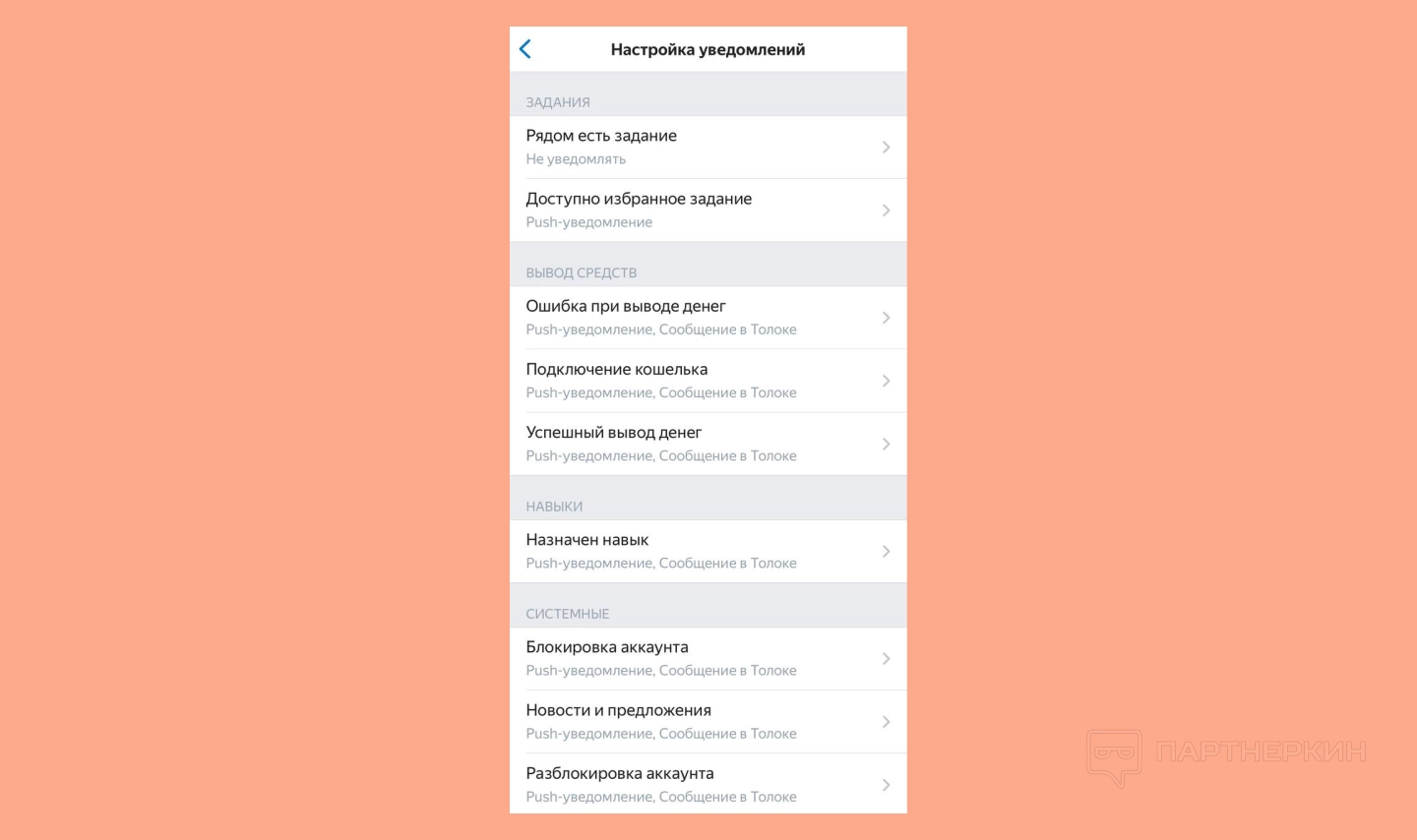 В настройках уведомлений немного другие возможности, чем в вебе, — тут можно также выбрать нужный тип оповещения, но способы оповещения будут другими. Всего три варианта — пуш-уведомления, письма на почту или внутренние сообщения в