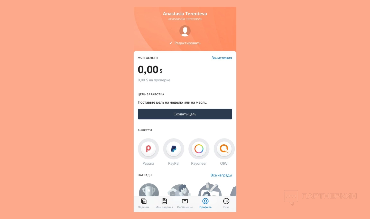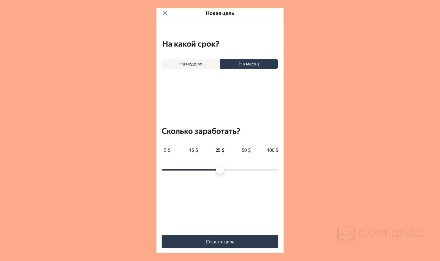 Далее есть интересный пункт — это цели заработка, и его нет в веб-версии. Здесь можно указать, какую цель преследует пользователь, и в зависимости от зачислений, шкала на пути к цели будет заполняться. Чтобы создать цель, нужно указать, на какой срок, — месяц или неделя — а также сколько денег хочется заработать — от $5 до $100. После указания цели появится отдельная кнопка просмотра прогресса — там будет указаны сама цель и сколько уже было получено средств.