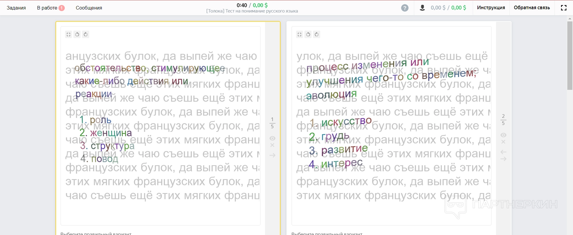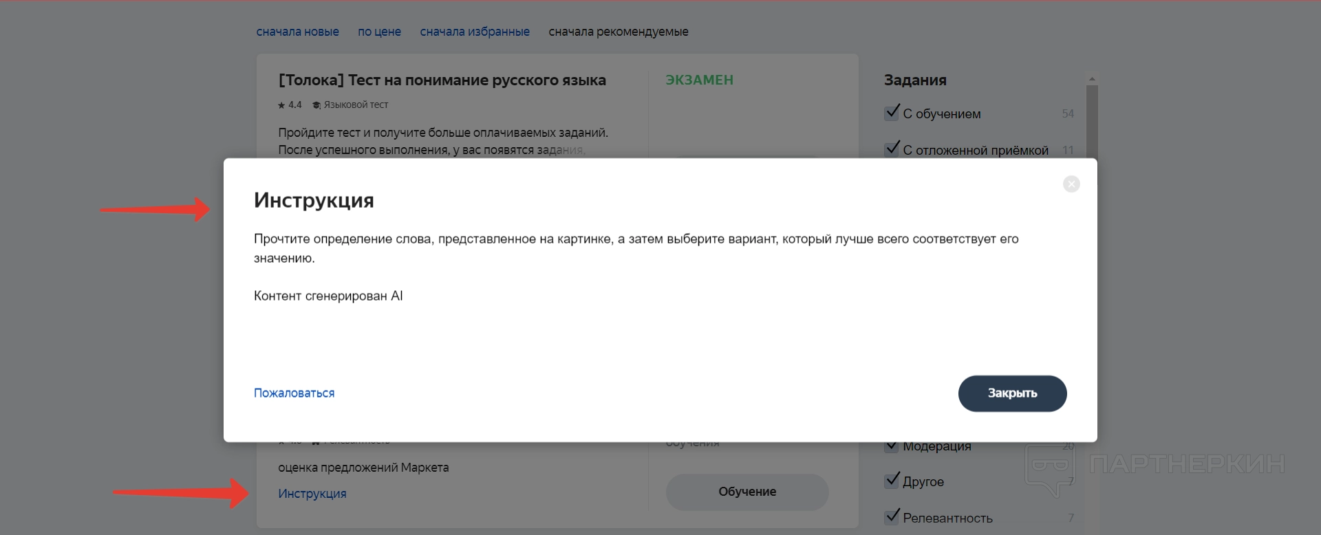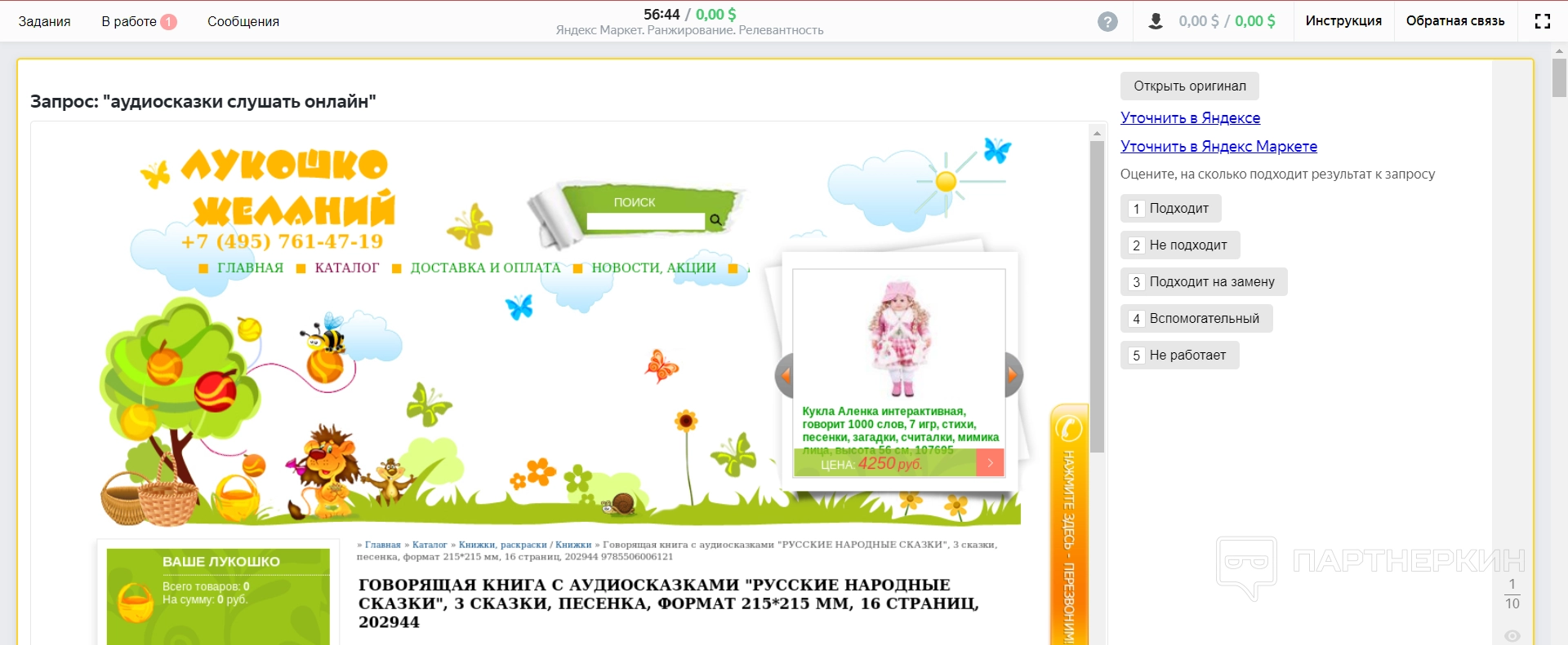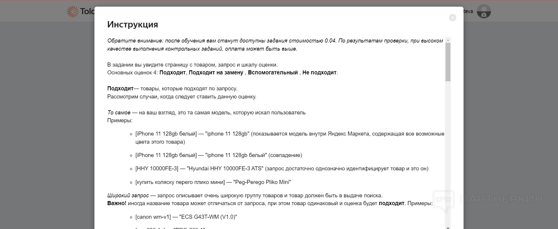 Для оптимальной работы поисковой системы также часто попадаются задания, где просят оценить, насколько подходят результаты поисковой выдачи под запрос пользователя. Здесь также предоставляются необходимые инструкции — после ее прочтения станет доступно само задание.