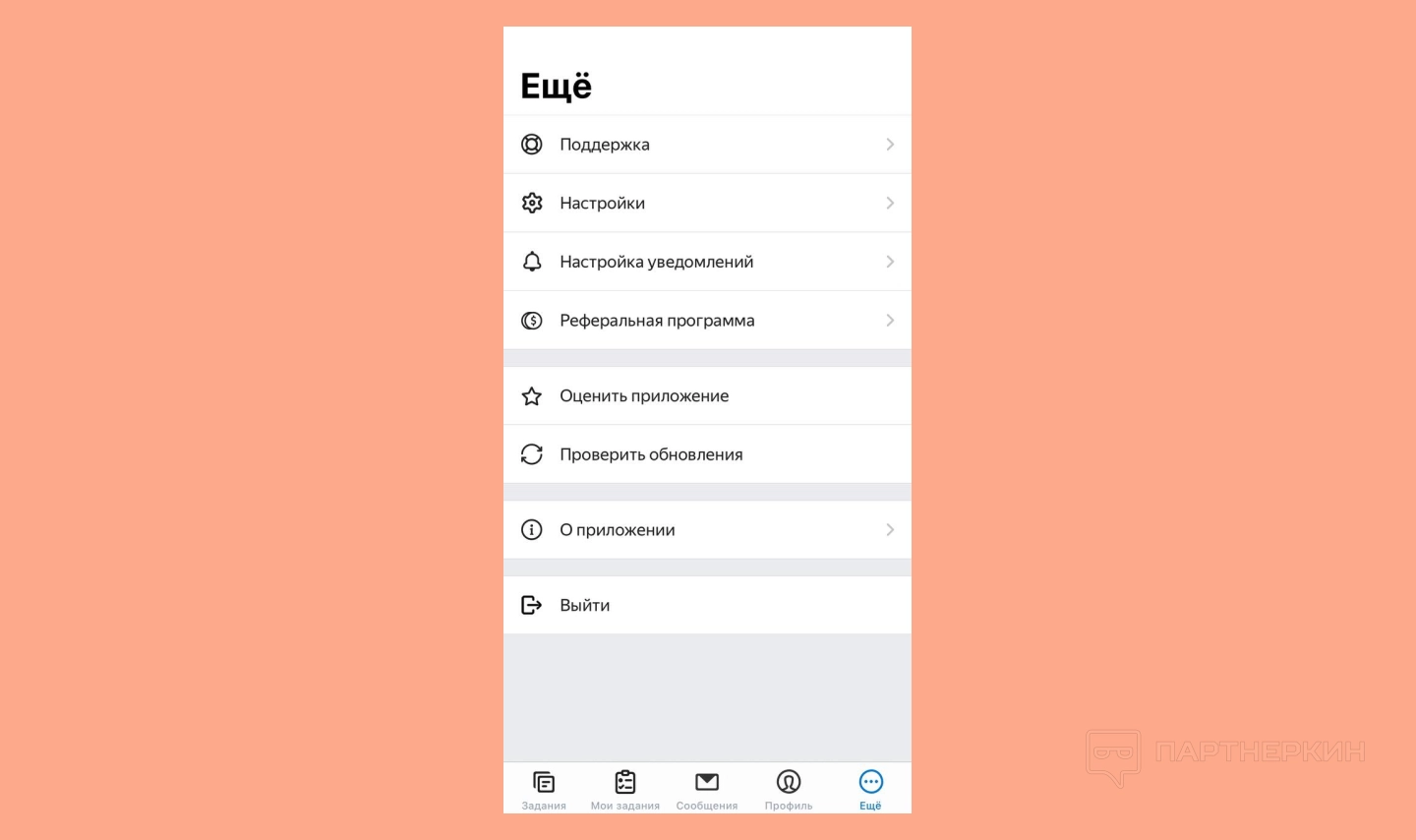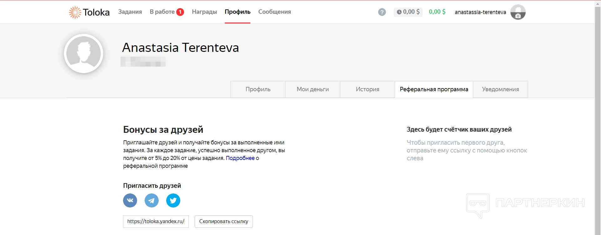 Пункт с реферальной программой описывает ее условия — там указано, что за каждого приглашенного друга пользователь будет получать процент от суммы выполненных им заданий, а это порядка 5-20%. Также ниже дается сама реферальная ссылка.