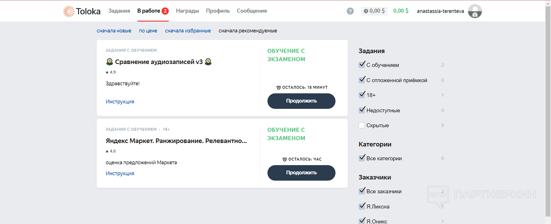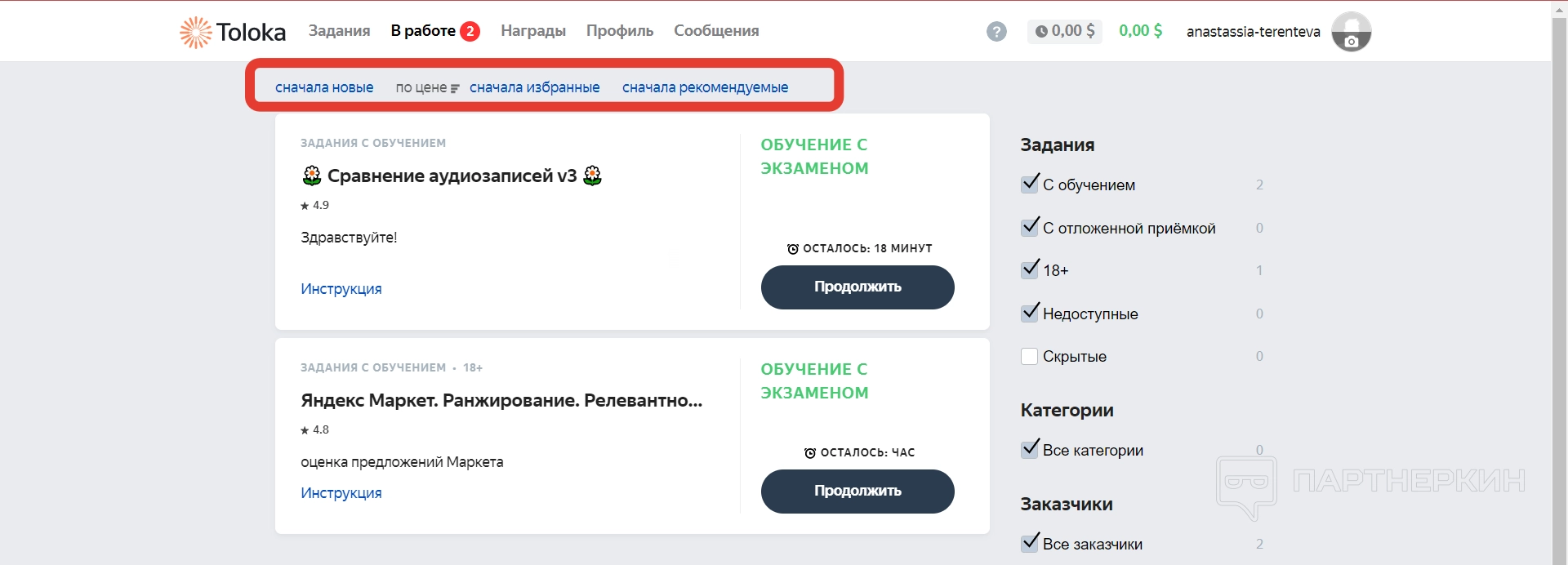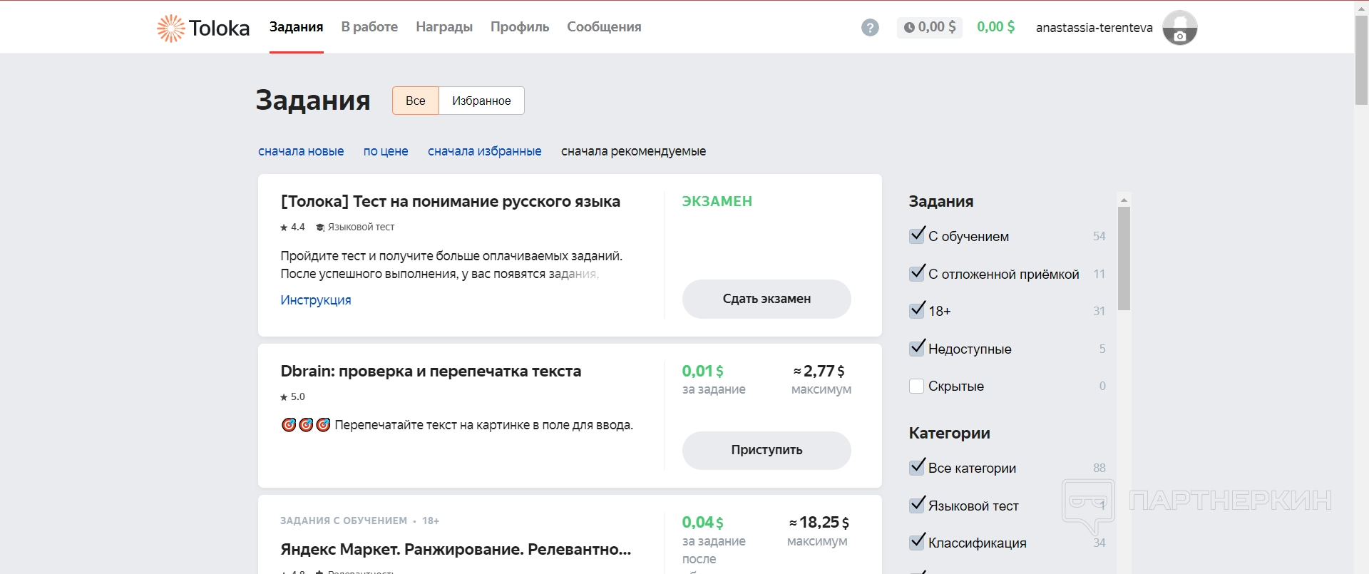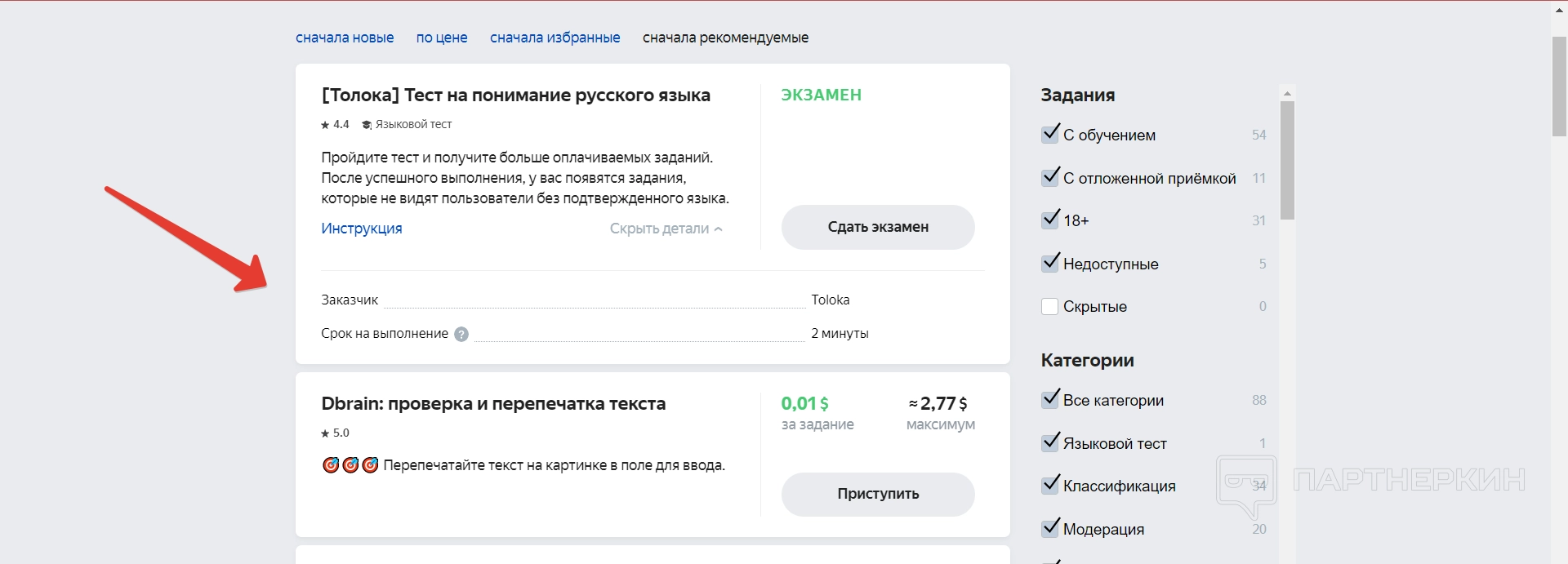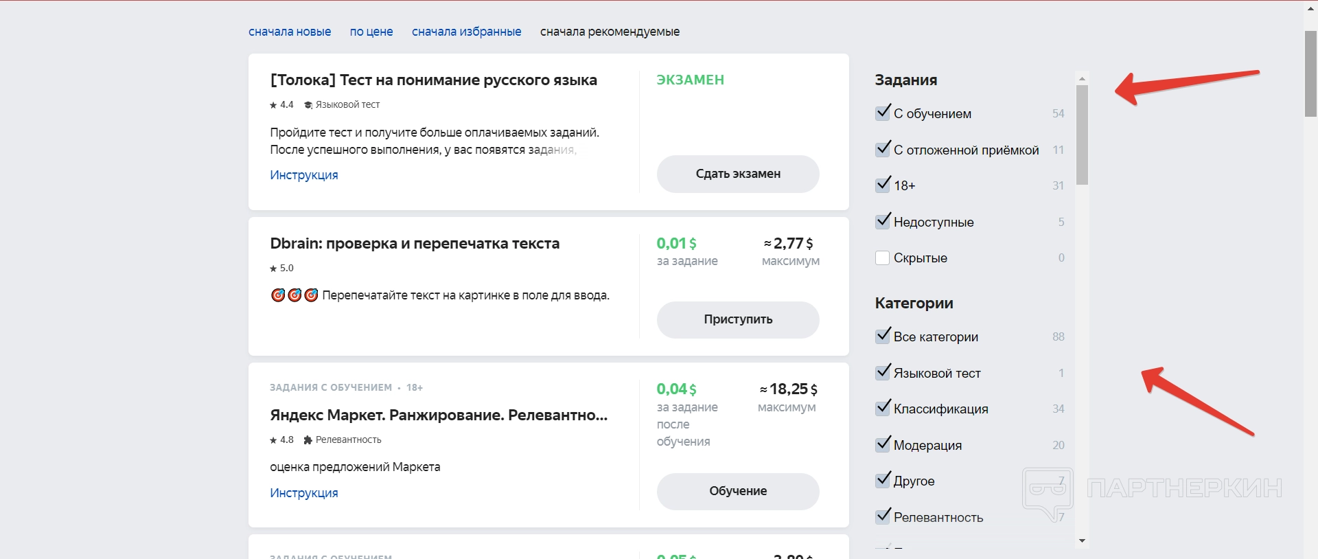 Задания — данный раздел включает все задания, которые сейчас есть на бирже. При всех их можно легко фильтровать через панель с правой стороны. Там можно указать тип задания и его категорию — например, можно отказаться выполнять задания 18+, а можно, наоборот, согласиться.