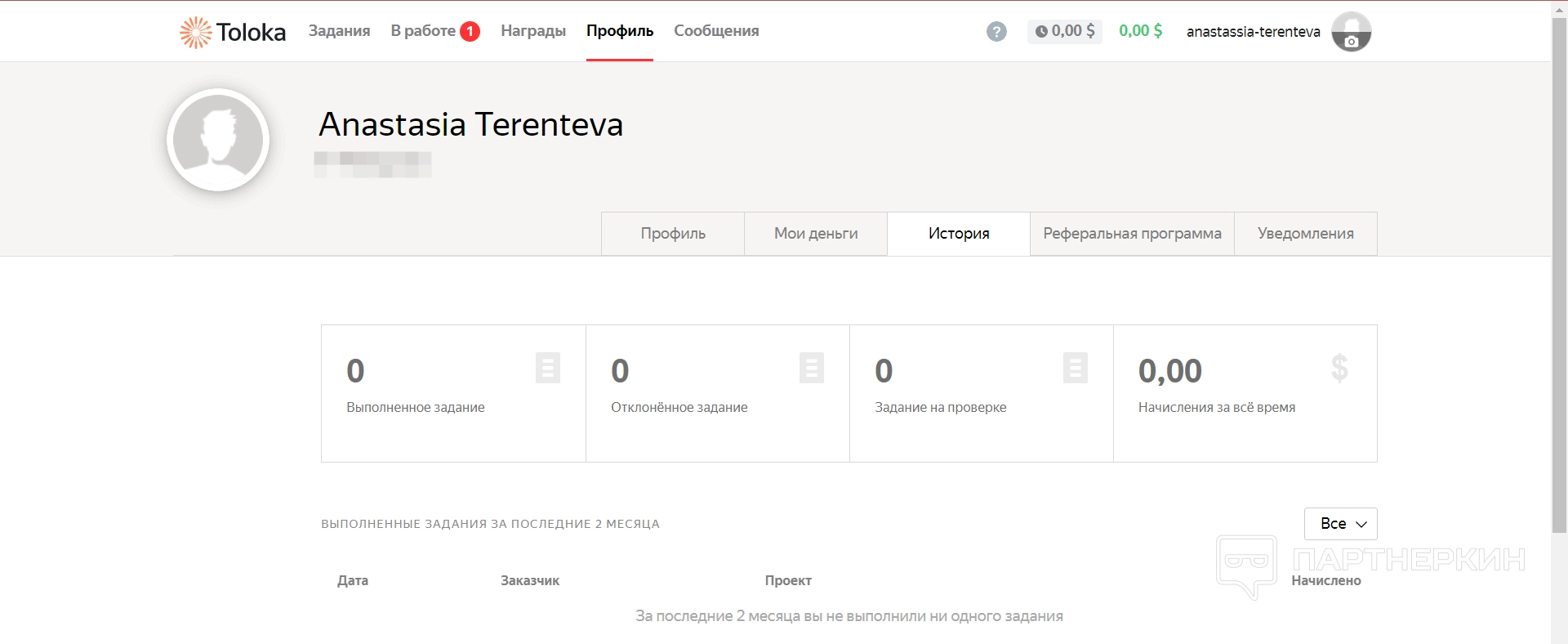 Пункт «История» содержит информацию обо всех задания пользователя — так указывается количество выполненных, отклоненных и тех заданий, которые находятся на проверке. Также отображается информация о средствах, которые были начислены на счет за все время работы. ВНизу есть более детальная статистика по заданиям за последние два месяца — там есть название задачи, данные о заказчике и дате выполнения, и сколько за выполнение работы было зачислено средств.
