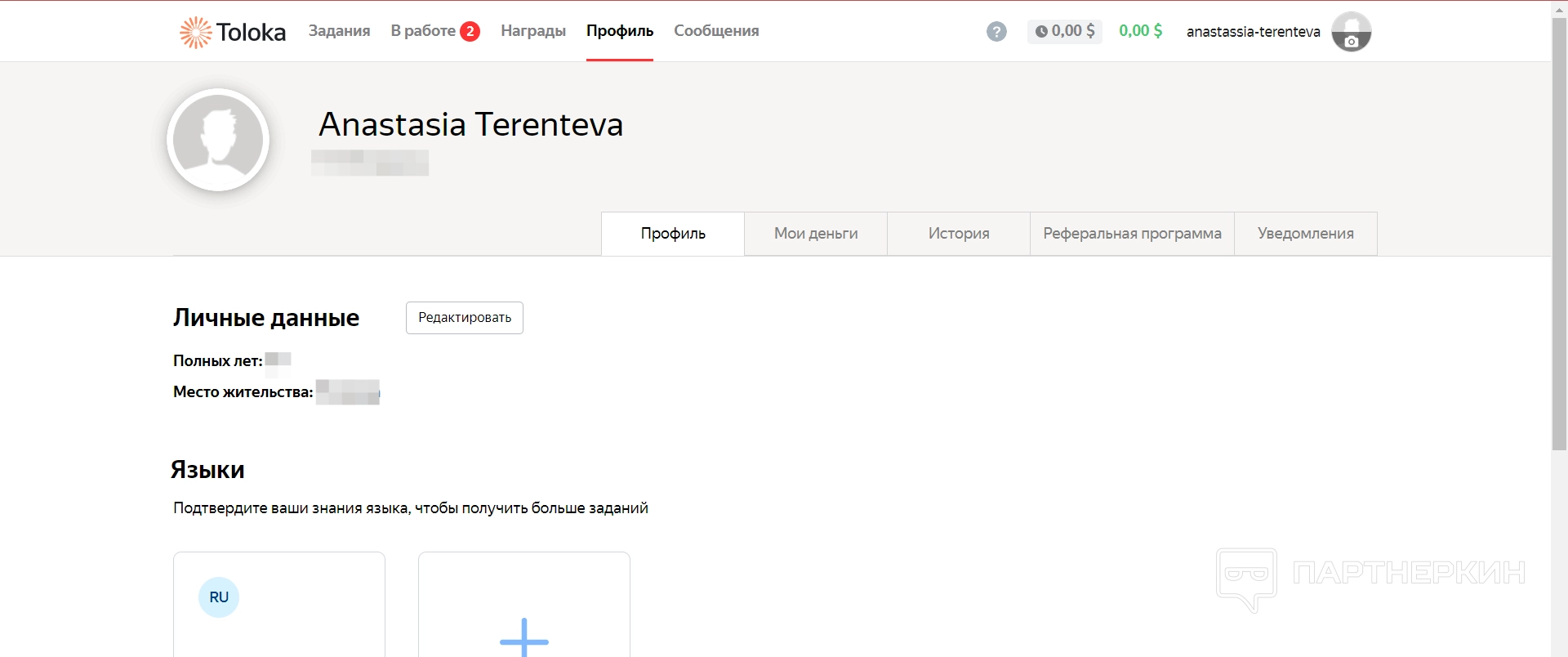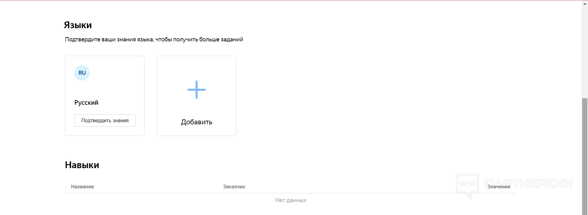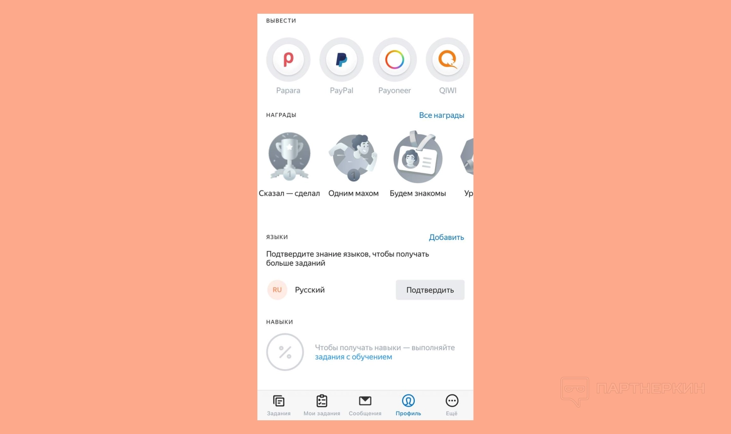 В главном пункте «Профиль» пользователь может указать, сколько ему лет, и где он живет. Здесь же вводится информация о знании определенных языков — чем больше языков будет указано, тем больше заданий будет получать пользователь. Кроме того, тут отображаются данные о навыках — они собираются на основе заданий, которые выполняет исполнитель. Показывается сам навык, заказчик, а также значение.