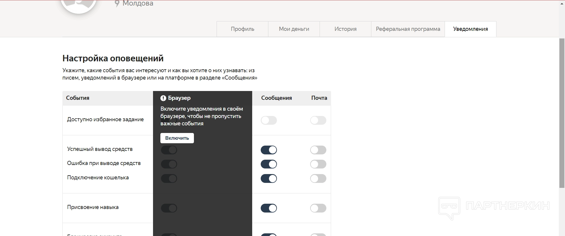 Последний пункт с уведомления позволяет настроить оповещения. Здесь можно выбрать событие, о котором будут оповещать — например, об успешном выводе средств, об ошибках с выводом или присвоении навыка. При этом можно указать, где именно будет оповещаться пользователь — в браузере, по сообщениям или по почте.