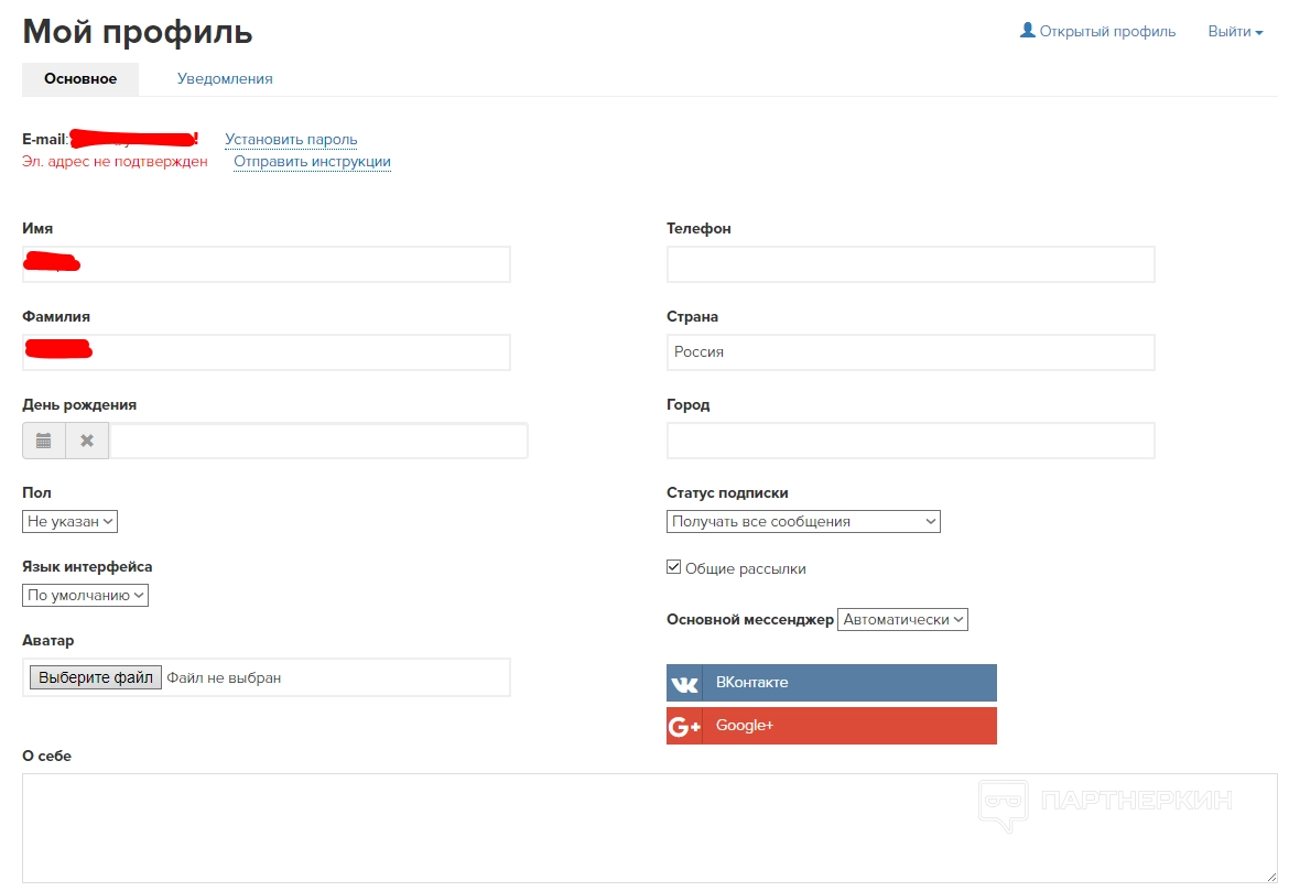 В профиле находится основная информация о пользователе. Можно изменить следующие параметры: