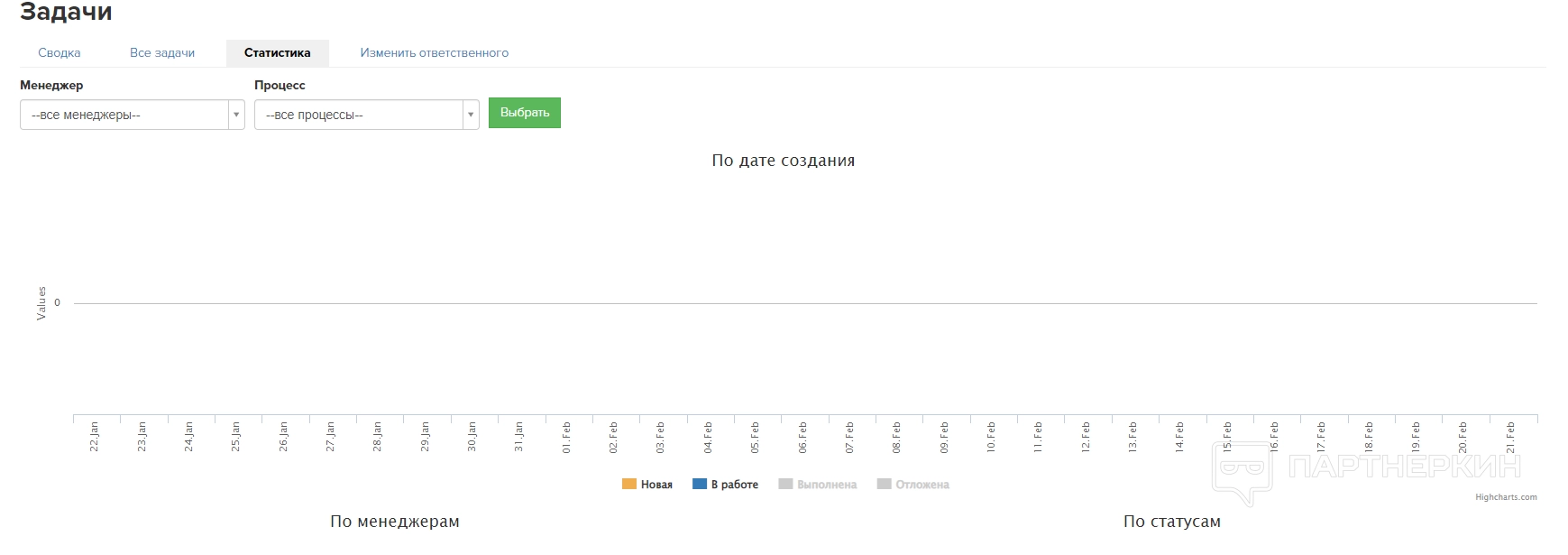 Раздел позволяет отследить список дел (новые, в работе, отложенные), проанализировать бизнес-процессы и посмотреть статистику по задачам.